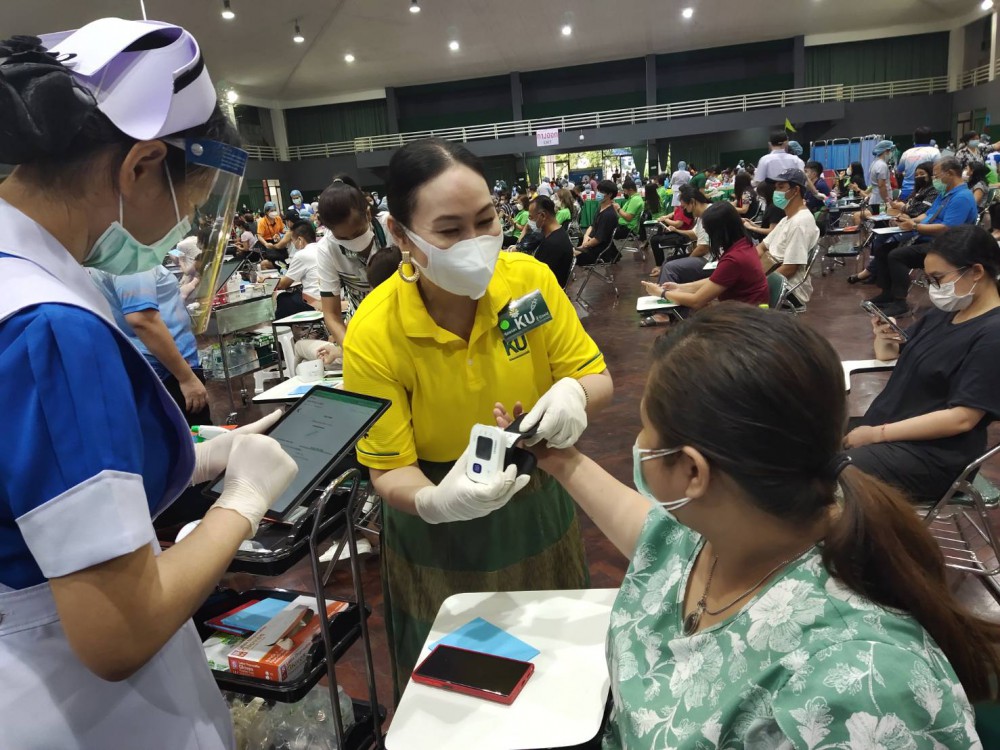 ” มหาวิทยาลัยเกษตรศาสตร์ บริการการฉีดวัคซีนในลักษณะ การแบบวัคซีนกลุ่ม GroupVaccination โดยมีกลุ่มเป้าหมาย ทั้งในหน่วยงานกระทรวง อว. เช่น วช GISDA สำนักงานปรมาณูเพื่อสันติ สถาบันสารสนเทศน้ำ และ หน่วยงานเครือข่าย เช่น สำนักงบประมาณ กระทรวงการพัฒนาสังคมและความมั่นคงของมนุษย์ กรมสรรพากร กระทรวงเกษตรและสหกรณ์ กรมอุทยานแห่งชาติ สัตว์ป่าและพันธุ์พืช กรมชลประทาน ประชาชน และ ชุมชนในรอบเขตจตุจักร บางเขน หลักสี่ เป็นต้น นิสิต และ นักศึกษา เกือบ 10 สถาบัน ได้แก่ เกษตรศาสตร์ พระจอมเกล้าพระนครเหนือ ศรีปทุม ธุรกิจบัณฑิตย์ เกริก ราชภัฏพระนคร ปัญญาภิวัฒน์ และ สุโขทัยธรรมาธิราช เป็นต้น” ดร.จงรัก กล่าว