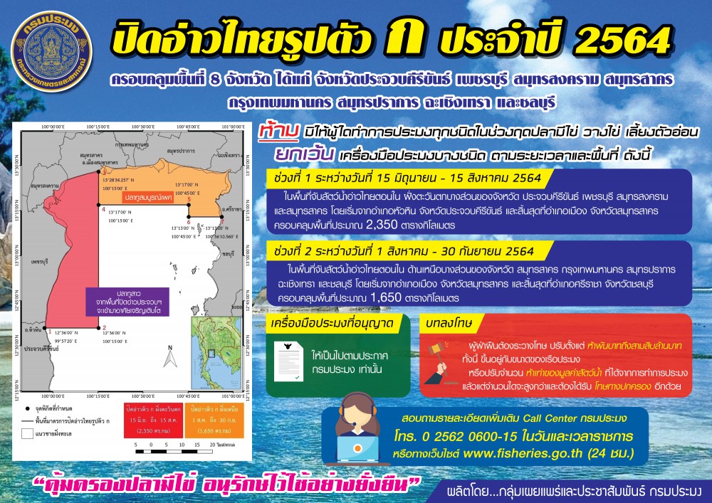นายบัญชา สุขแก้ว รองอธิบดีกรมประมง กล่าวว่า กรมประมงประกาศใช้มาตรการปิดอ่าวไทยรูปตัว ก ประจำปี 2564 จำนวน 2 ช่วง ดังนี้ • ช่วงที่ 1 : วันที่ 15 มิถุนายน – 15 สิงหาคม 2564 ในพื้นที่จับสัตว์น้ำอ่าวไทยตอนใน ฝั่งตะวันตก บางส่วนของจังหวัดประจวบคีรีขันธ์ เพชรบุรี สมุทรสงคราม และสมุทรสาคร โดยเริ่มจากอำเภอหัวหิน จังหวัดประจวบคีรีขันธ์ และสิ้นสุดที่อำเภอเมือง จังหวัดสมุทรสาคร ครอบคลุมพื้นที่ประมาณ 2,350 ตารางกิโลเมตร