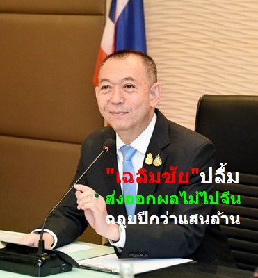 “เฉลิมชัย” สุดปลื้ม ดันส่งออกผลไม้ไทยโดยเฉพาะทุเรียนไปยังจีนประสบผลสำเร็จอย่างงาม รวมถึงผลิตภัณฑ์ทางการเกษตรมีมูลค่ากว่าแสนล้านบาท เผยทุเรียนครองแชมป์อันดับหนึ่ง ชี้เฉพาะ 4 เดือนแรกปีนี้การส่งออกทุเรียนถึง 213,328 ตัน มูลค่า 28,615 ล้านบาท ระบุเกิดจากการเข้มงวดมาตรการทุกระดับ ยึดมั่นตามแนวทาง WHO และ FAO ทำให้เกิดความมั่นจากจากประเทศคู่ค้า