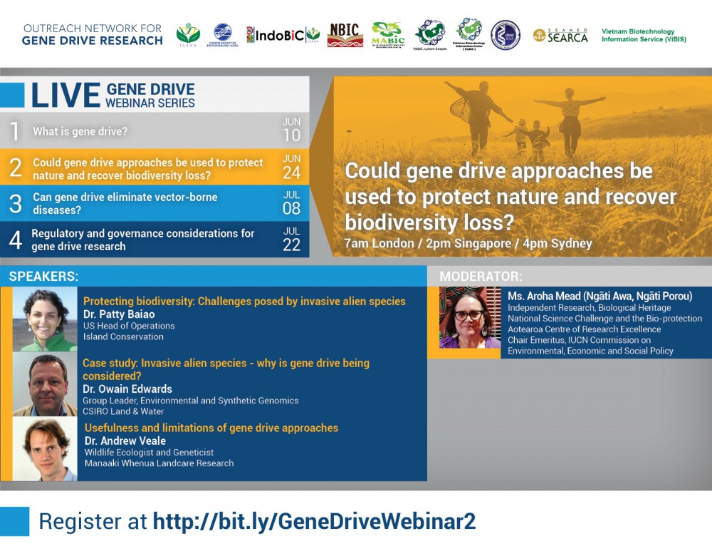 องค์การ ISAAA ร่วมกับ Outreach Network for Gene Drive Research และ Biotechnology Information Centers จะจัดสัมมนาผ่านเว็บภาค 2ของ Gene Drive Webinar Series ในหัวข้อ Gene Drive สามารถใช้เพื่อปกป้องธรรมชาติและฟื้นฟูการสูญเสียความหลากหลายทางชีวภาพได้หรือไม่โดยจะจัดขึ้นในวันที่ 24 มิถุนายน 2564 เวลา 14.00 น. มะนิลา (07:00 น. ลอนดอน/16:00 น. ซิดนีย์/13.00 น. กรุงเทพ) ผ่าน Zoom