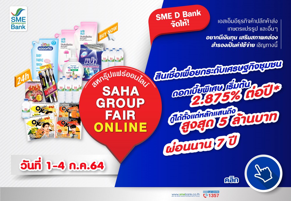 SME D Bank จัดมหกรรมช้อปปิ้งออนไลน์ครั้งยิ่งใหญ่ มีสินค้าจากกว่า 200 แบรนด์ดังมาลดราคาพิเศษ พร้อมจัดโปรโมชั่นสินเชื่อดอกเบี้ยถูกร่วมงาน “สหกรุ๊ปแฟร์ออนไลน์” วันที่ 1-4 ก.ค. 64 หนุนเอสเอ็มอีไทยเสริมสภาพคล่องข้ามผ่านวิกฤตโควิด-19