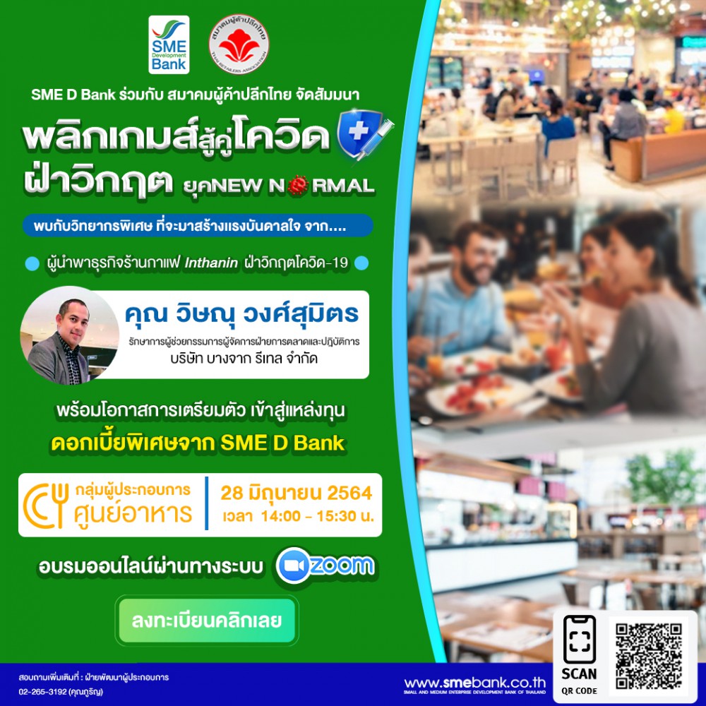 SME D Bank – สมาคมผู้ค้าปลีกไทย ร่วมจัดกิจกรรมอบรมออนไลน์ วันที่ 28-29 มิ.ย.นี้ พาเอสเอ็มอีกลุ่มธุรกิจร้านอาหาร และร้านค้าปลีกในฟู้ดคอร์ทตามศูนย์การค้า และห้างสรรพสินค้า เข้าถึงซอฟต์โลน ไม่ต้องใช้หลักทรัพย์ค้ำประกัน เพื่อเสริมสภาพคล่อง ประคองธุรกิจก้าวผ่านวิกฤตโควิด-19