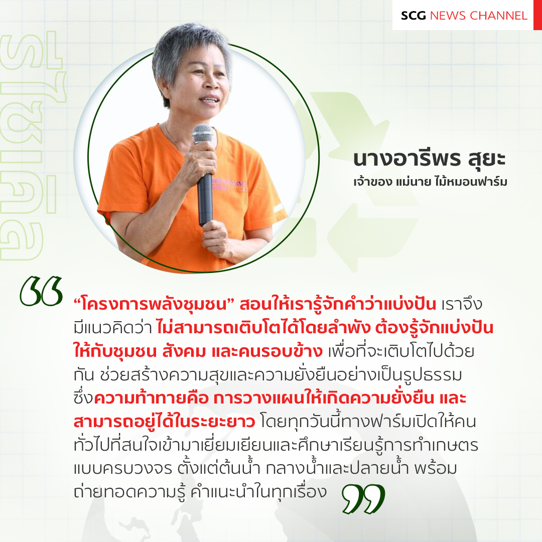 “โครงการพลังชุมชน ที่จัดโดยเอสซีจี สอนให้เรารู้จักคำว่าแบ่งปันให้กับสังคมและชุมชน เราจึงมีแนวคิดว่า ไม่สามารถเติบโตได้โดยลำพัง ต้องรู้จักแบ่งปันให้กับชุมชน สังคม และคนรอบข้าง เพื่อที่จะเติบโตไปด้วยกัน ช่วยสร้างความสุขและความยั่งยืนอย่างเป็นรูปธรรม ซึ่งความท้าทายก็คือ การวางแผนที่จะทำอย่างไรให้เกิดความยั่งยืน และชุมชนโดยรอบ สามารถอยู่ได้ในระยะยาว โดยทุกวันนี้ทางฟาร์มเปิดให้คนทั่วไปที่สนใจเข้ามาเยี่ยมเยียนและศึกษาเรียนรู้การทำเกษตรแบบครบวงจร ตั้งแต่ต้นน้ำ กลางน้ำและปลายน้ำ พร้อมจะถ่ายทอดความรู้ คำแนะนำในทุกเรื่อง” อารีพร กล่าว