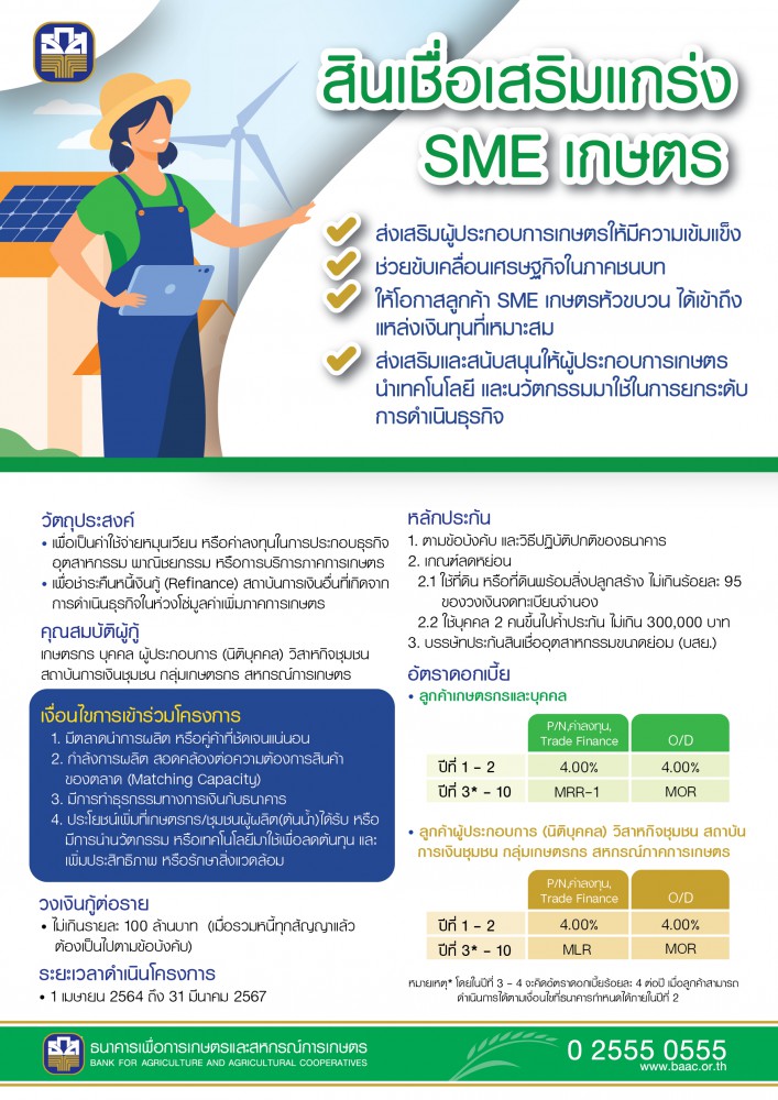 1. สินเชื่อเสริมแกร่ง SME เกษตรวงเงินรวม 30,000 ล้านบาท เพื่อเป็นค่าใช้จ่ายหมุนเวียนหรือค่าลงทุนในการประกอบธุรกิจโดยมีเงื่อนไขการเข้าร่วมโครงการ 4 ข้อ ประกอบด้วย(1)มีตลาดหรือคู่ค้าที่ชัดเจนแน่นอน (2) มีกำลังการผลิตที่สอดคล้องกับความต้องการสินค้าของตลาด (Matching Capacity) (3)มีการทำธุรกรรมทางการเงินกับธนาคาร และ (4) มีการสร้างประโยชน์เพิ่มให้กับเกษตรกรหรือชุมชนผู้ผลิต (ต้นน้ำ)หรือมีการนำนวัตกรรมและเทคโนโลยีมาใช้ลดต้นทุนและเพิ่มประสิทธิภาพหรือรักษาสิ่งแวดล้อมกำหนดวงเงินกู้ไม่เกิน 100ล้านบาทต่อรายทั้งนี้เงื่อนไขเป็นไปตามข้อบังคับของธนาคารอัตราดอกเบี้ย ปีที่ 1 – 2 ร้อยละ 4 ต่อปี และปีที่ 3 – 10 อัตราดอกเบี้ยMRR-1 / MLR / MOR ตามประเภทของลูกค้า (ปัจจุบัน MRR เท่ากับร้อยละ 6.5 ต่อปี / MLR เท่ากับร้อยละ 4.875 ต่อปี และ MOR เท่ากับร้อยละ 6.25ต่อปี) กรณีที่ผู้ประกอบการสามารถดำเนินการได้ตามเงื่อนไขอย่างใดอย่างหนึ่งเพิ่มเติม ดังนี้