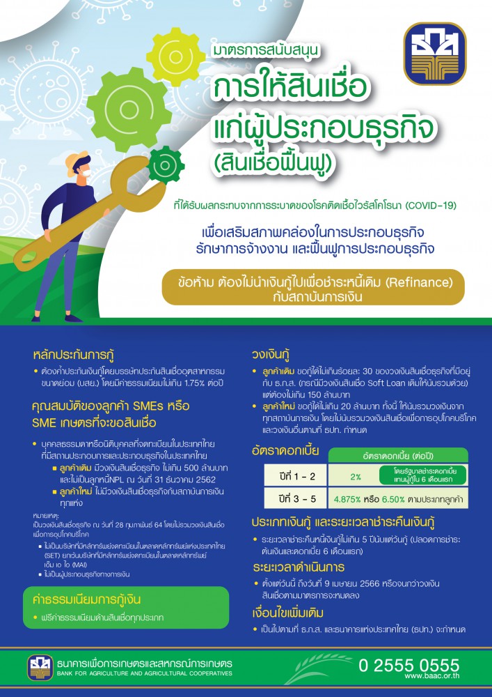 2. มาตรการสนับสนุนการให้สินเชื่อแก่ผู้ประกอบธุรกิจ (สินเชื่อฟื้นฟู)วงเงินรวม 5,000 ล้านบาท โดยสนับสนุนสินเชื่อเพื่อเสริมสภาพคล่องต้นทุนต่ำให้แก่ผู้ประกอบธุรกิจที่มีศักยภาพ แต่ประสบปัญหาสภาพคล่องในการดำเนินธุรกิจและลดผลกระทบต่อการจ้างงานที่เป็นลูกค้าเกษตรกรบุคคลผู้ประกอบการ(นิติบุคคล) กลุ่มเกษตรกรวิสาหกิจชุมชนกองทุนหมู่บ้านและชุมชนเมืองสหกรณ์ภาคการเกษตรและสหกรณ์นอกภาคการเกษตรที่ประกอบธุรกิจพาณิชยกรรมอุตสาหกรรมและบริการ โดยลูกค้าเดิม สามารถขอวงเงินสินเชื่อเพิ่มเติม ได้ไม่เกินร้อยละ 30 ของวงเงินสินเชื่อธุรกิจณวันที่ 31 ธันวาคม 2562หรือณวันที่ 28 กุมภาพันธ์ 2564 แล้วแต่จำนวนใดจะสูงกว่าแต่ไม่เกิน 150 ล้านบาท (โดยให้นับรวมวงเงินSoft Loan เดิมด้วย)