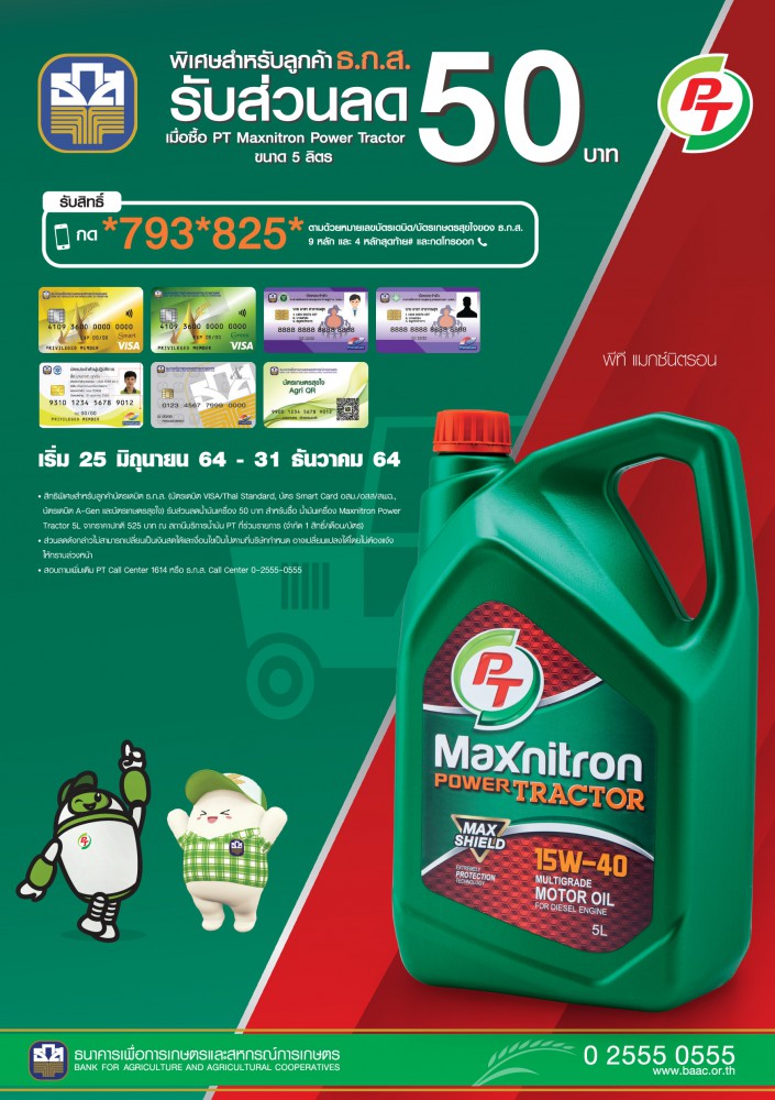 สำหรับแคมเปญที่ 2 รับส่วนลดนํ้ามันเครื่องมูลค่า 50 บาท เมื่อซื้อนํ้ามันเครื่อง Maxnitron PowerTractorขนาด5 ลิตรจากราคาปกติ 525 บาทขั้นตอนการรับส่วนลดเพียงพิมพ์ข้อความในโทรศัพท์มือถือ *793*825* ตามด้วยหมายเลขบัตรเดบิต หรือ บัตรเกษตรสุขใจของ ธ.ก.ส. 9 หลักแรก และ 4 หลักสุดท้าย # และกดโทรออก พร้อมแจ้งรหัสส่วนลดที่ได้รับจาก SMS ให้กับพนักงาน ณ สถานีบริการน้ำมันพีทีที่ร่วมรายการจำกัด 1สิทธิ์/เดือน/บัตรระยะเวลาตั้งแต่บัดนี้ถึง 31 ธันวาคม 2564