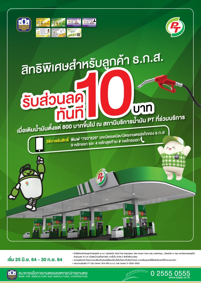 เพื่อลดภาระค่าครองชีพในช่วงสถานการณ์ COVID-19 ให้กับผู้ถือบัตรธ.ก.ส. ร่วมกับ บริษัท พีทีจี เอ็นเนอยี จำกัด (มหาชน) (พีทีจี) ผู้ให้บริการสถานีบริการน้ำมันพีที มอบส่วนสุดพิเศษโดยแคมเปญที่ 1 รับส่วนลด 10 บาท เมื่อเติมน้ำมันตั้งแต่ 800 บาทขึ้นไป/เซลล์สลิปขั้นตอนการรับส่วนลดเพียงพิมพ์ข้อความในโทรศัพท์มือถือ *793*826* ตามด้วยหมายเลขบัตรเดบิต หรือ บัตรเกษตรสุขใจของ ธ.ก.ส. 9 หลักแรก และ 4 หลักสุดท้าย # และกดโทรออก พร้อมแจ้งรหัสส่วนลดที่ได้รับจาก SMS ให้กับพนักงาน ณ สถานีบริการน้ำมันพีทีที่ร่วมรายการจำกัด 2 สิทธิ์/เดือน/บัตร ระยะเวลาตั้งแต่บัดนี้ถึง 30 กันยายน 2564