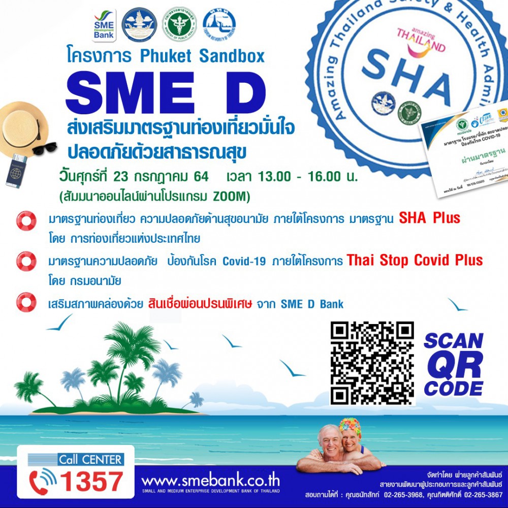 ธนาคารพัฒนาวิสาหกิจขนาดกลางและขนาดย่อมแห่งประเทศไทย (ธพว.) หรือ SME D Bank ร่วมกับหน่วยงานภาครัฐ กระทรวงการท่องเที่ยวและกีฬา กระทรวงสาธารณสุข และการท่องเที่ยวแห่งประเทศไทย (ททท.) จัดสัมมนาออนไลน์ “โครงการ Phuket Sandbox SME D ส่งเสริมมาตรฐานท่องเที่ยวมั่นใจ ปลอดภัยด้วยสาธารณสุข” ผ่านระบบ Zoom Meeting ในวันศุกร์ที่ 23 กรกฎาคม 2564 เวลา 13.00-16.00 น.