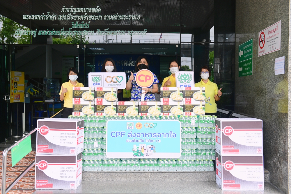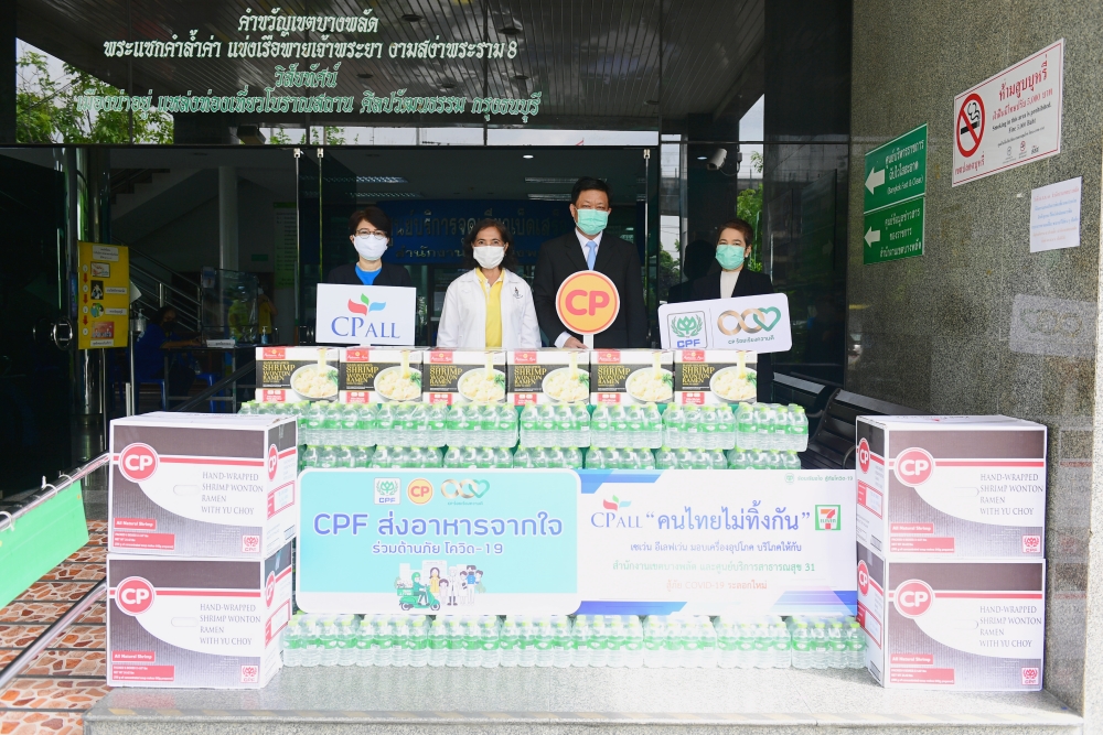 บริษัท เจริญโภคภัณฑ์อาหาร จำกัด (มหาชน) หรือ ซีพีเอฟ ผนึกกำลัง บริษัท ซีพี ออลล์ จำกัด (มหาชน) หรือ เซเว่น อีเลฟเว่น เดินหน้ามอบอาหารสำเร็จรูปพร้อมทานคุณภาพปลอดภัยและน้ำดื่ม ในโครงการ “CPF ส่งอาหารจากใจ ร่วมต้านภัยโควิด-19” และ “คนไทยไม่ทิ้งกัน” ตามนโยบายเครือเจริญโภคภัณฑ์ แก่ นางสาวปัญชพัฒน์ หลักดี ผู้อำนวยการเขตบางพลัด พร้อมด้วยนางกัญมณี เดชประดิษฐ์ ผู้ช่วยผู้อำนวยการเขตฯ เพื่อสนับสนุนการปฏิบัติงานและเป็นกำลังใจให้บุคลากรทางการแพทย์และอาสาสมัครในการตรวจหาเชื้อไวรัสโควิด-19 เชิงรุกให้ประชาชน บริเวณใต้สะพานพระราม 8 โดยมี นายวิโรจน์ ยุทธยงค์ รองกรรมการผู้จัดการอาวุโส ซีพีเอฟ และนางสาวรติชา วิริวุฒิกร ผู้แทน ซีพี ออลล์ ร่วมส่งมอบ