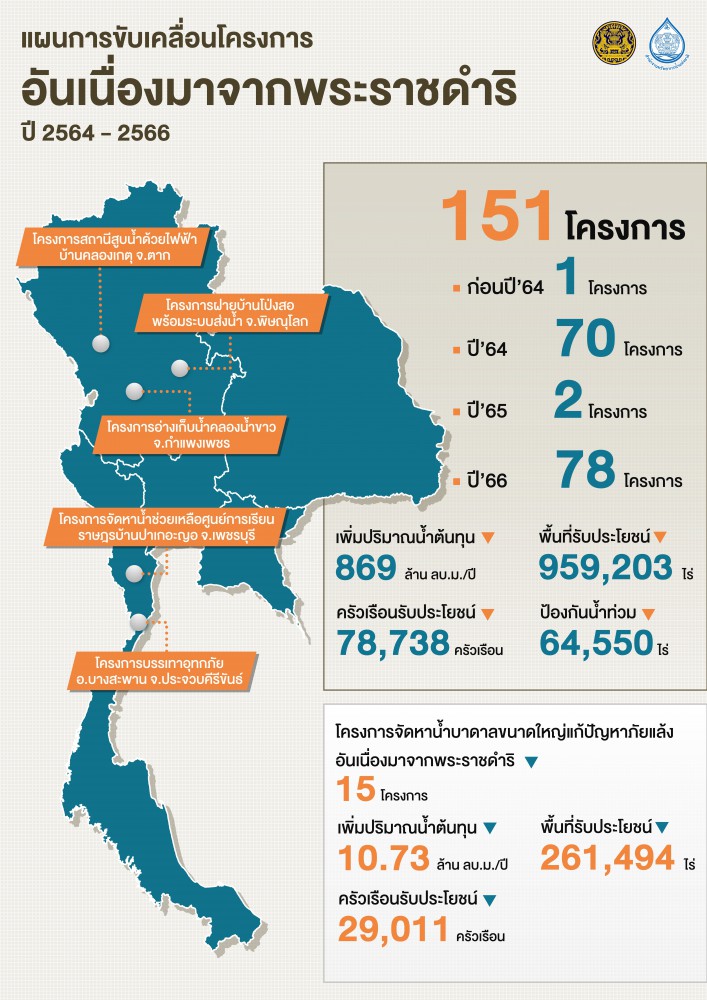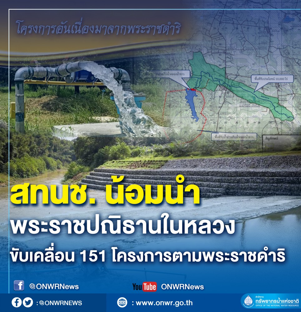 สทนช.บูรณาการทุกภาคส่วนสนองพระราชกระแสในหลวง ร.10 “สืบสาน รักษา และต่อยอด” เร่งเดินหน้าขับเคลื่อน 151 โครงการอันเนื่องมาจากพระราชดำริ ที่ กนช.รับทราบแผนการดำเนินงานตั้งแต่ปี 2564-2566 ให้เป็นไปตามเป้าหมาย เผยเมื่อแล้วเสร็จ จะเพิ่มพื้นที่เพื่อการเกษตร มีน้ำใช้กว่า 959,000 ไร่ ชาวบ้านได้รับประโยชน์ 78,738 ครัวเรือน ป้องกันน้ำท่วมครอบคลุม 64,550 ไร่