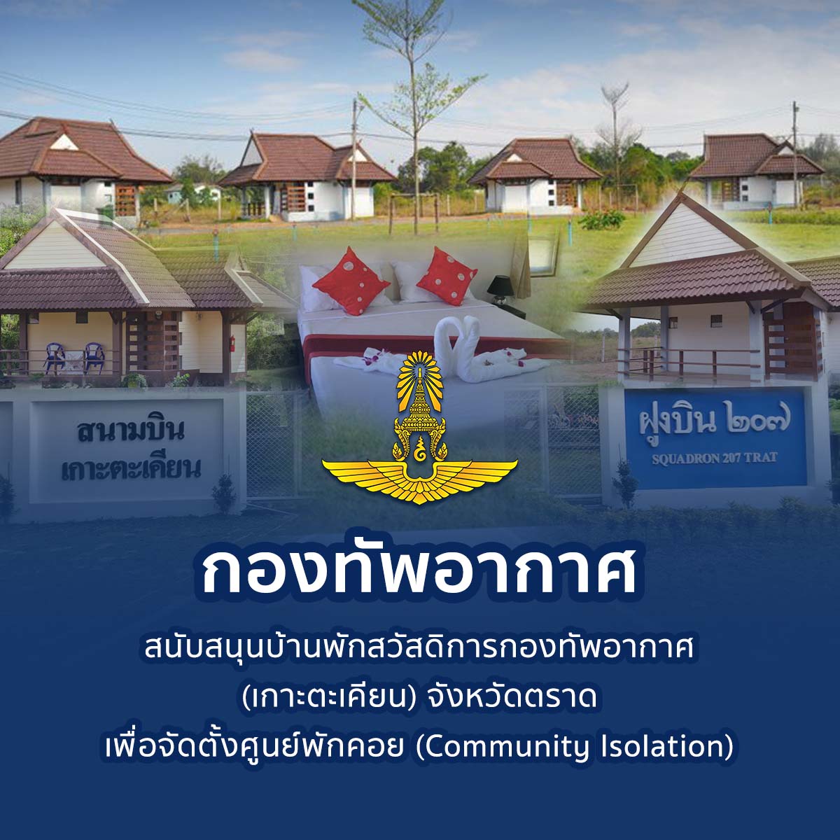 กองทัพอากาศ ประกาศพร้อมให้การสนับสนุนกำลังพล ยุทโธปกรณ์ ทรัพยากรของกองทัพอากาศ และให้ร่วมมือกับหน่วยงานภาครัฐ ภาคเอกชน และองค์กร เพื่อหยุดยั้งการแพร่ระบาดของเชื้อโควิด-19 ล่าสุดให้บ้านพักสวัสดิการกองทัพอากาศ สำนักงาน ที่เกาะตะเคียนจังหวัดตราด จัดตั้งศูนย์พักคอย (Community Isolation) สำหรับผู้ที่ติดเชื้อโควิด