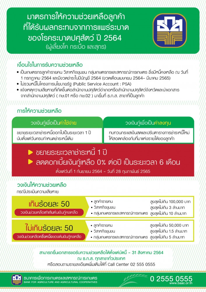ธ.ก.ส.ออกมาตรการช่วยเหลือเกษตรกร วิสาหกิจชุมชน สหกรณ์ที่ได้รับผลกระทบจากโรคระบาดปศุสัตว์ โดยเฉพาะโรคลัมปี สกิน ที่แพร่ระบาดในโค กระบือ และโรคระบาดอื่น ๆ ในสุกร ด้วยการขยายระยะเวลาชำระหนี้1 ปี และลดดอกเบี้ยเงินกู้เหลือ 0%ต่อปี เป็นระยะเวลา 6 เดือน สามารถแจ้งความประสงค์ได้ตั้งแต่บัดนี้ถึง 31 ส.ค. 64 ณ ธ.ก.ส. ทุกสาขาทั่วประเทศ