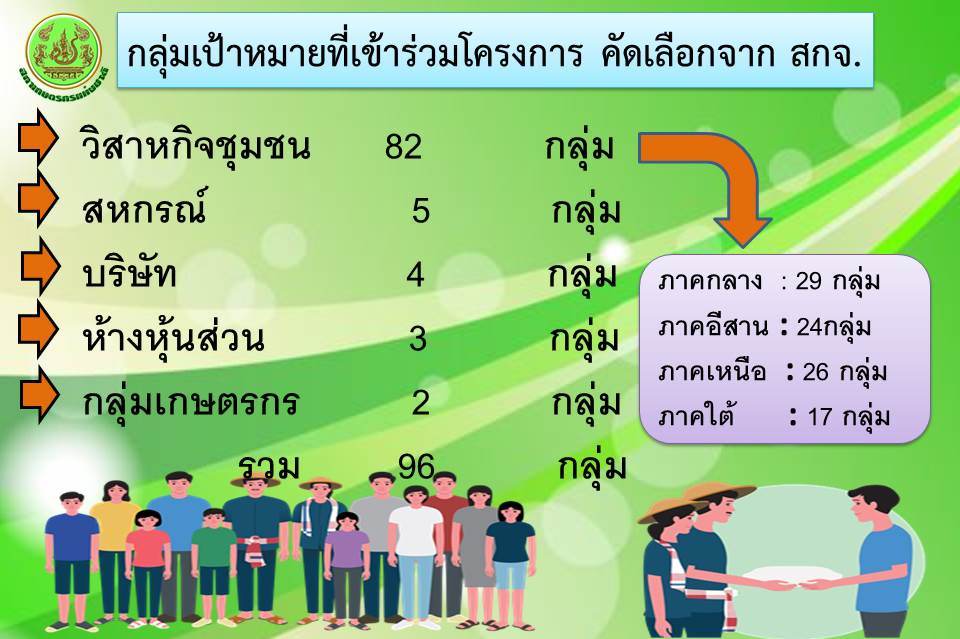 กลุ่มเป้าหมาย 3 กลุ่มดังกล่าวข้างต้น ที่มีฐานะเป็นนิติบุคคล และ/หรือจดทะเบียนถูกต้องกับหน่วยงานภาครัฐ ซึ่งปัจจุบันสำนักงานสภาเกษตรกรจังหวัด (สกจ.) ได้คัดเลือกกลุ่มเป้าหมายเข้าร่วมโครงการ รวม 96 กลุ่ม ได้แก่ วิสาหกิจชุมชน 82 กลุ่ม สหกรณ์ 5 กลุ่ม บริษัท 4 กลุ่ม ห้างหุ้นส่วน 3 กลุ่ม และ กลุ่มเกษตรกร 2 กลุ่ม แบ่งเป็น ภาคเหนือ 26 กลุ่ม ภาคอีสาน 24 กลุ่ม ภาคกลาง 29 กลุ่ม และภาคใต้ 17 กลุ่ม ภายใต้งบประมาณ 8,800,000 บาท โดยดำเนินการภายในเดือนสิงหาคม 2564