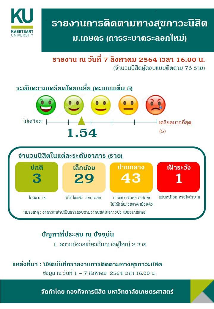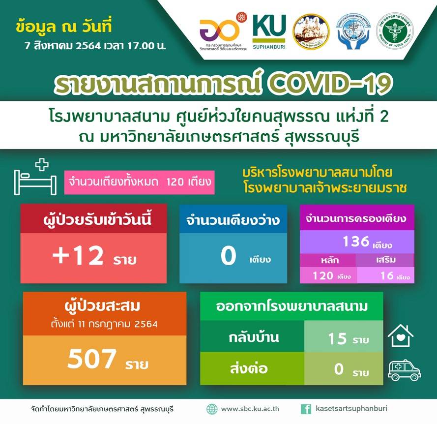 1.2 ศูนย์พักคอย 3 แห่ง ได้แก่ สถานีฝึกอาชีพ ตำบลเพนียด จังหวัดลพบุรี คณะเกษตร ,สถานีฝึกนิสิตวนศาสตร์ วังน้ำเขียว จังหวัดนครราชสีมา ,และวิทยาเขตกำแพงแสน ซึ่งมีผู้ติดเชื้อมาเข้ารับการดูแลโดยสาธารณสุขในจังหวัดต่างๆ จนเต็มจำนวนเตียงที่ได้กำหนดไว้ และยังดำเนินการอย่างต่อเนื่อง
