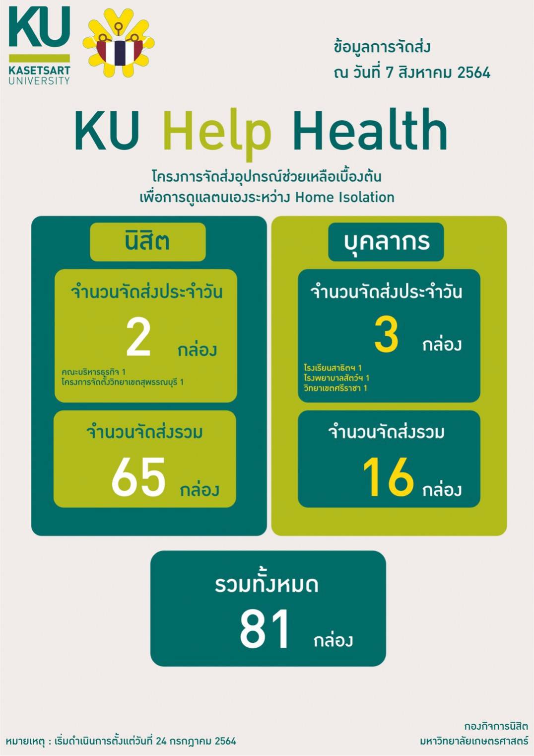 3.โครงการ KU Help Health เพื่อจัดส่ง KU help health box ประกอบด้วยอุปกรณ์เวชภัณฑ์ ยา และอาหารแห้งที่จำเป็นให้กับผู้ป่วยโควิด-19 ที่รักษาตัวอยู่ ณ ที่พักอาศัย เพื่อบรรเทาอาการเจ็บป่วยจากโควิดเบื้องต้นได้ เนื่องจากโรงพยาบาลไม่สามารถรองรับผู้ป่วยซึ่งปัจจุบันได้เพิ่มขึ้นเป็นจำนวนมาก โดยมีการจัดส่ง KU Help Health Box ให้แก่นิสิต บุคลากร มก. และชุมชนใกล้เคียงมหาวิทยาลัย