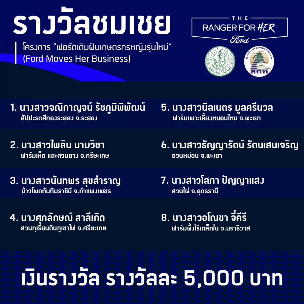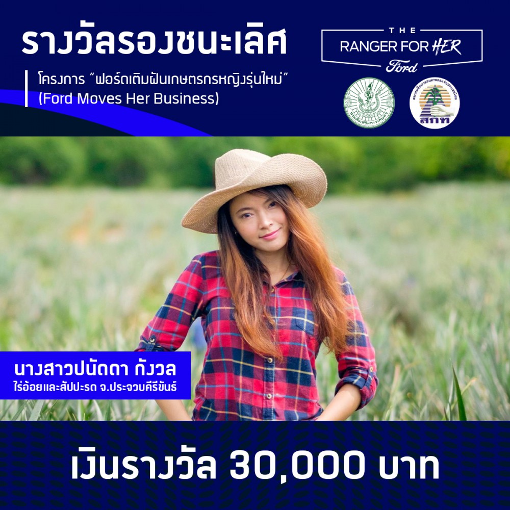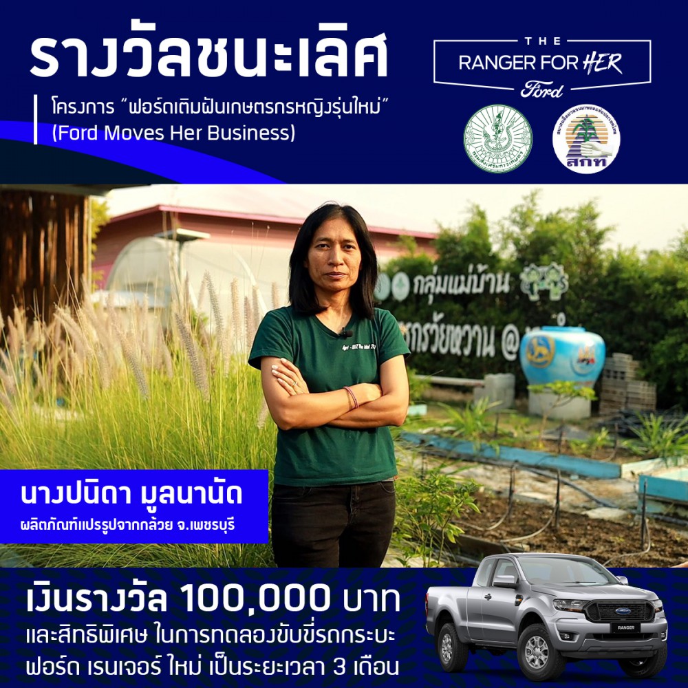 สำหรับผู้ที่ได้รับรางวัลชนะเลิศจากโครงการ “ฟอร์ดเติมฝันเกษตรกรหญิงรุ่นใหม่ (Ford Moves Her Business)” ได้แก่ นางปนิดา มูลนานัด เกษตรกรหญิงผู้ทำธุรกิจแปรรูปกล้วยเพิ่มมูลค่าผลผลิตทางการเกษตร จากจังหวัดเพชรบุรี จะได้รับรางวัลเป็นทุนต่อยอดธุรกิจมูลค่า 100,000 บาท และสิทธิพิเศษในการทดลองขับรถกระบะ ฟอร์ด เรนเจอร์ เป็นระยะเวลา 3 เดือน