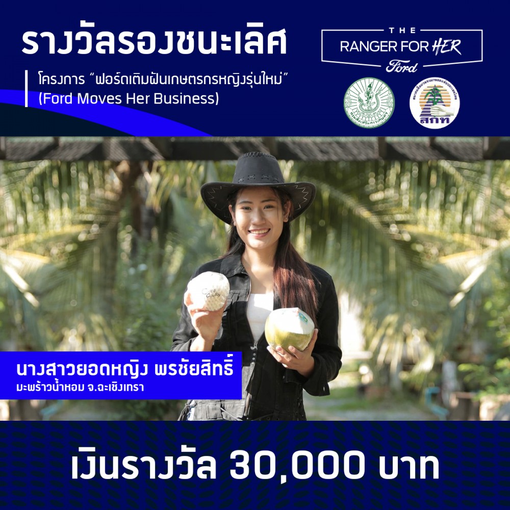 รางวัลรองชนะเลิศ จำนวน 2 รางวัลเป็นของ นางสาวยอดหญิง พรชัยสิทธิ์ เจ้าของธุรกิจมะพร้าวน้ำหอม โคโค่ คาวบอย จากจังหวัดฉะเชิงเทรา และนางสาวปนัดดา กังวล เจ้าของไร่อ้อยและสัปปะรด จากจังหวัดประจวบคีรีขันธ์ ได้รับทุนสนับสนุนรางวัลละ 30,000 บาท นอกจากนี้ ฟอร์ดยังมอบรางวัลชมเชยให้แก่ผู้เข้ารอบสุดท้ายรายอื่นๆ เป็นเงินทุนสนับสนุนมูลค่า 5,000 บาท จำนวนทั้งสิ้น 8 รางวัล