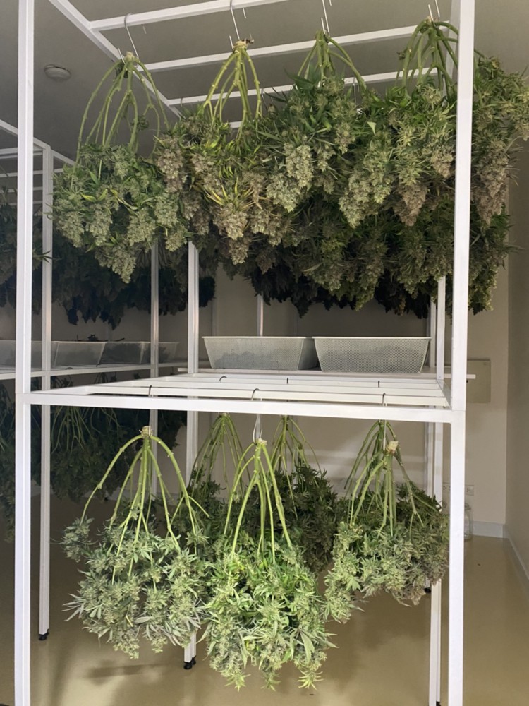 เมื่อต้นกัญชาอยู่ในห้องปลูกครบ 11 สัปดาห์ ก็ทำการเก็บเกี่ยวโดยใช้กรรไกรตัดที่โคนต้น แล้วนำต้นที่ได้มาแขวนตาก (drying) ในห้องมืดที่ควบคุมอุณหภูมิ 22 – 24°C และความชื้นสัมพัทธ์ที่ 60 % เพื่อให้ช่อดอกกัญชาค่อยๆ แห้ง ใช้ระยะเวลาประมาณ 10 – 14 วัน ช่อดอกที่แห้งจะมีความชื้นประมาณ 10 % แล้วนำไปบ่ม (curing) ในภาชนะปิดอีก 3 – 4 สัปดาห์ จากนั้นจึงนำช่อดอกที่ผ่านการบ่มแล้วไปลงบันทึกจำนวน และน้ำหนัก แล้วเก็บไว้ในห้องเก็บผลผลิตหรือนำไปสกัดสารสำคัญเพื่อใช้ประโยชน์ต่อไป