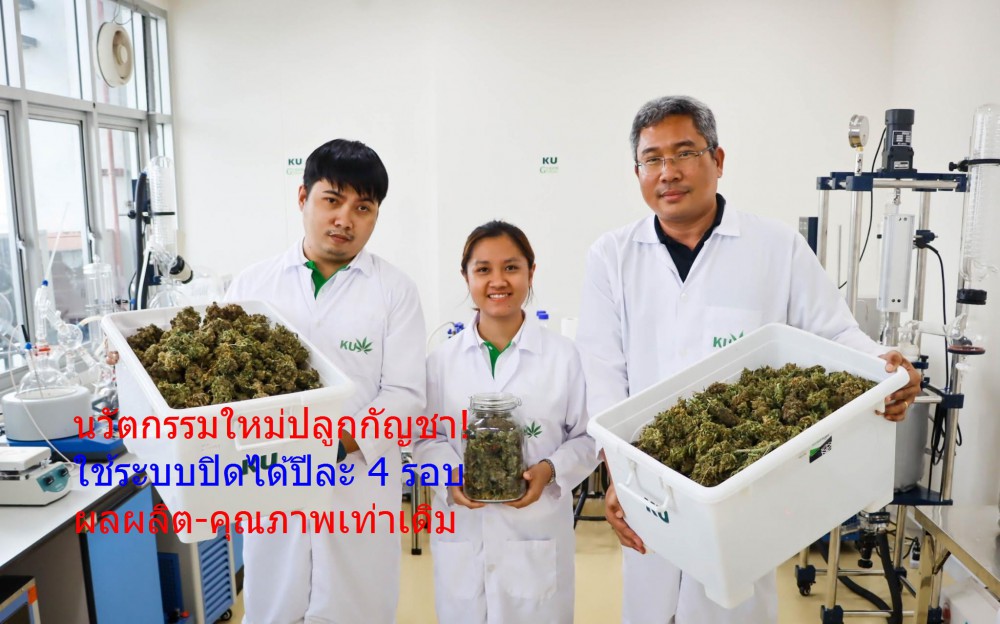 นักวิจัยคณะเกษตร มก.พัฒนาต้นแบบปลูกกัญชา เพื่อใช้ประโยชน์ทางการแพทย์รูปแบบใหม่ “ระบบปิด” ควบคุมอุณหภูมิที่ 24 -28 °C ความชื้นสัมพัทธ์ที่ 50 – 60 % เปิดแสงสว่างนานวันละ 18 ชั่วโมง มืด 6 ชั่วโมง ช่วงสร้างช่อดอกเปิดแสงสว่างเท่ากันมืด-สว่าง 12 ชั่วโมง/วัน เผยผลการทดลองทำให้ตายอดต้นกัญชาเปลี่ยนจากการสร้างใบมาเป็นการสร้างช่อดอกแทน และสามารถให้ผลผลิตช่อดอกแห้งต้นละ 162.85 กรัม ปลูกได้ปีละถึง 4 รอบให้ผลผลิตสม่ำเสมอ และมีคุณภาพเหมือนกัน
