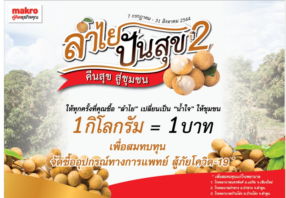 บริษัท สยามแม็คโคร จำกัด ช่วยชาวสวนลำไยระบายผลผลิต พร้อมเชิญลูกค้าประชาชนร่วมทำบุญกับโครงการ “ลำไย ปันสุข…คืนสุข สู่ชุมชน ปี 2” โดยทุกการซื้อลำไย 1 กิโลกรัม เท่ากับเป็นการร่วมบริจาค 1 บาท