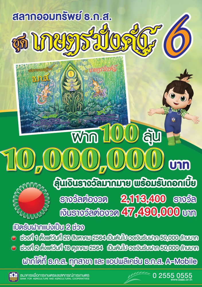 นายธนารัตน์ งามวลัยรัตน์ ผู้จัดการธนาคารเพื่อการเกษตรและสหกรณ์การเกษตร (ธ.ก.ส.) เปิดเผยว่าจากการที่ ธ.ก.ส. ได้เปิดรับฝาก“สลากออมทรัพย์ ธ.ก.ส. ชุดเกษตรมั่งคั่ง 6” จำนวน 1,000 ล้านหน่วย หน่วยละ 100 บาท รวมวงเงิน 100,000 ล้านบาท มีอายุการรับฝาก 3 ปีลุ้นรางวัลสูงสุด 10ล้านบาทรวมมูลค่าสูงสุดกว่า 47ล้านบาทต่อเดือนซึ่งแบ่งการเปิดรับฝากเป็น 2 ช่วง ได้แก่ ช่วงที่ 1 ตั้งแต่วันที่ 20 สิงหาคม 2564 เป็นต้นไปวงเงินรับฝาก 50,000 ล้านบาท ช่วงที่ 2 เปิดรับฝากอีกวันที่ 18 ตุลาคม 2564 เป็นต้นไป วงเงินรับฝาก 50,000 ล้านบาท