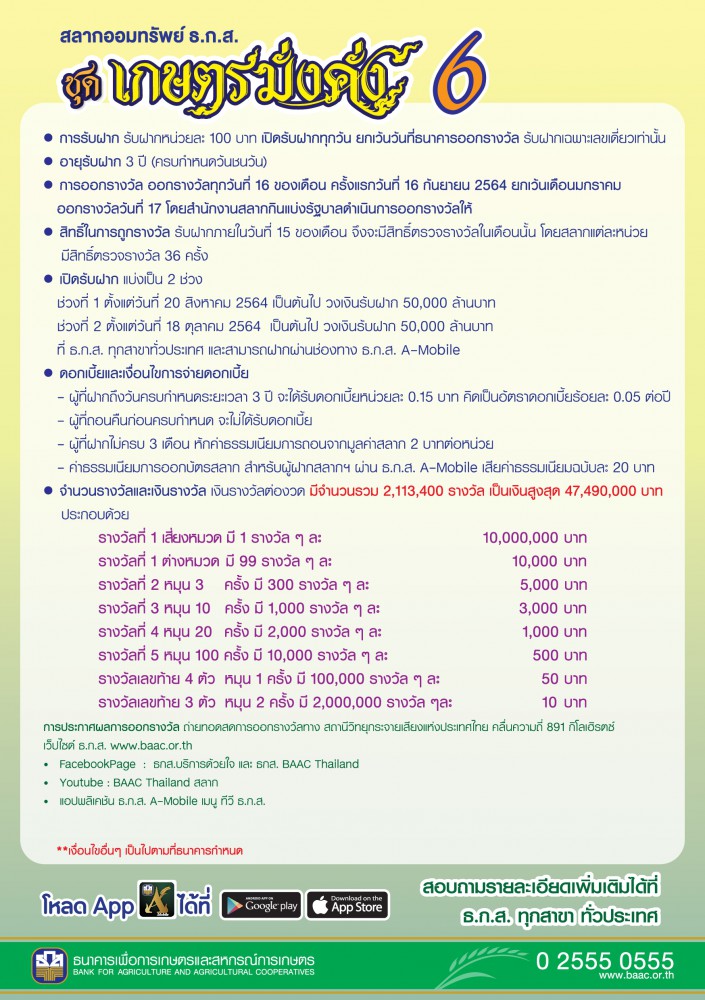ธ.ก.ส.ปลื้ม!สลากออมทรัพย์ ธ.ก.ส. ชุดเกษตรมั่งคั่ง 6 หน่วยละ 100 บาท วงเงิน 50,000 ล้านบาท ลุ้นรางวัล 10 ล้านบาทเปิดรับฝากวันแรก 20 สิงหาคม 2564 คนแห่ไปฝากเพียงครึ่งวันเต็มวงเงิน 5 หมื่นล้านบาท ประกาศขอบคุณลูกค้าผู้มีอุปการคุณทุกท่านที่ให้การตอบรับเป็นอย่างดี พบกันใหม่รับฝากอีกครั้ง ในวันที่ 18 ตุลาคมนี้ วงเงิน 50,000 ล้านบาทเท่าเดิม ผ่านช่องทาง ธ.ก.ส. A-Mobile และ ธ.ก.ส. ทุกสาขาทั่วประเทศ