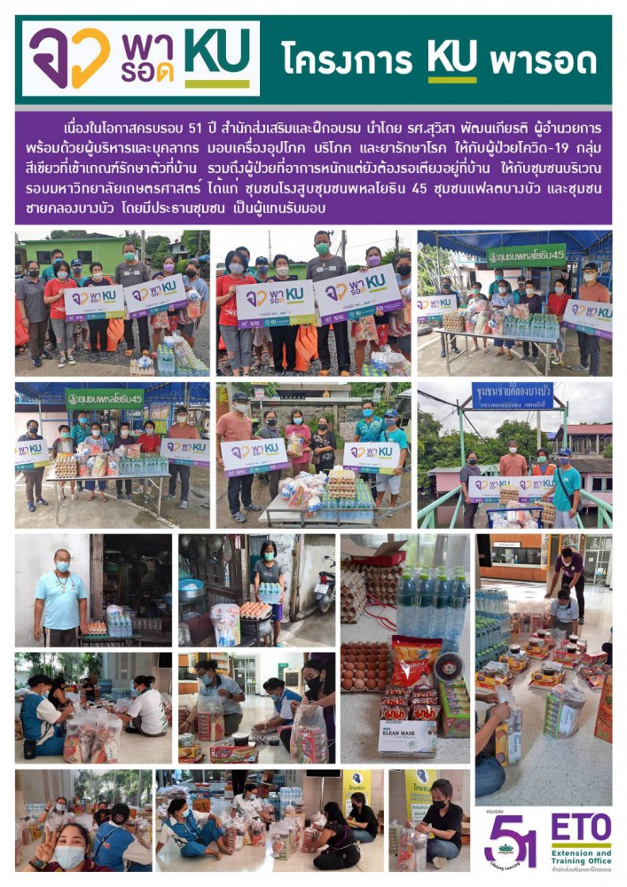 ดังนั้นจึงถือเป็นภารกิจเร่งด่วนช่วยเหลือในระยะสั้น ที่ทุกวิทยาเขต ได้นำอาหาร น้ำดื่ม นมเกษตร ยารักษาโรค และสิ่งของจำเป็นพื้นฐานต่อการดำรงชีวิตไปมอบแก่ประชาชน เด็ก และผู้สูงวัยที่อยู่ที่บ้านตามชุมชนต่างๆ รอบมหาวิทยาลัย และวิทยาเขต และถ้าบุคคลเหล่านั้นสามารถออกมาปฏิบัติงานได้ ก็อาจจะหาทางจ้างงานในระยะสั้นๆ เพื่อแบ่งเบาความเดือดร้อนของประชาชนรอบมหาวิทยาลัย ทั้งนี้เพื่อพาประชาชนรอด KU พารอด สอดรับกับโครงการ อว. พารอด หรือ survival