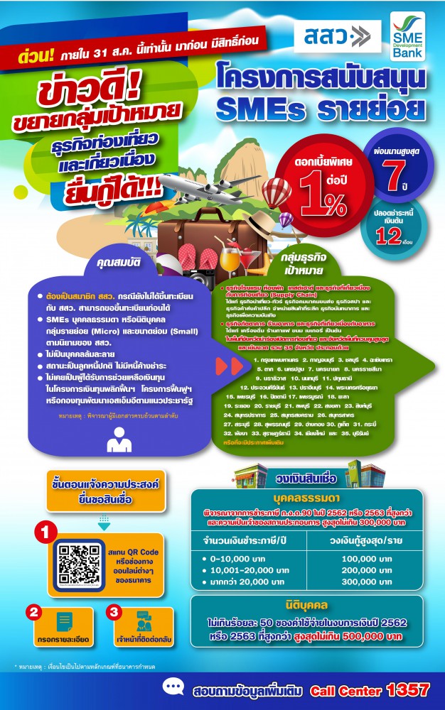 สสว. จับมือ SME D Bank เดืนน้าช่วยเหลือเอสเอ็มอีธุรกิจเกี่ยวเนื่องการท่องเที่ยว ขยายกลุ่มเป้าหมายมีสิทธิ์ยื่นกู้ “โครงการสนับสนุน SMEs รายย่อย” ดอกเบี้ย 1% ต่อปี ในพื้นที่ 35 จังหวัด พิเศษสุดผ่อนนานสูงสุด 7 ปี ปลอดชำระคืนเงินต้นสูงสุดไม่เกิน 1 ปี เผยใช้เกณฑ์พิจารณาจากฐานการเสียภาษี หนุนเข้าถึงแหล่งทุนง่ายและรวดเร็ว แนะรีบแจ้งความประสงค์ภายใน ส.ค.นี้