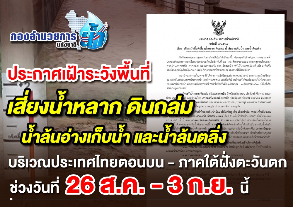 กองอำนวยการน้ำแห่งชาติ ออกประกาศฉบับที่ 8/2564 เฝ้าระวังพื้นที่เสี่ยงน้ำหลาก ดินถล่ม น้ำล้นอ่างเก็บน้ำขนาดกลางมี 20 แห่งที่เสี่ยง และน้ำล้นตลิ่ง บริเวณประเทศไทยตอนบน – ภาคใต้ฝั่งตะวันตก ในช่วงวันที่ 26 ส.ค. – 3 ก.ย. นี้