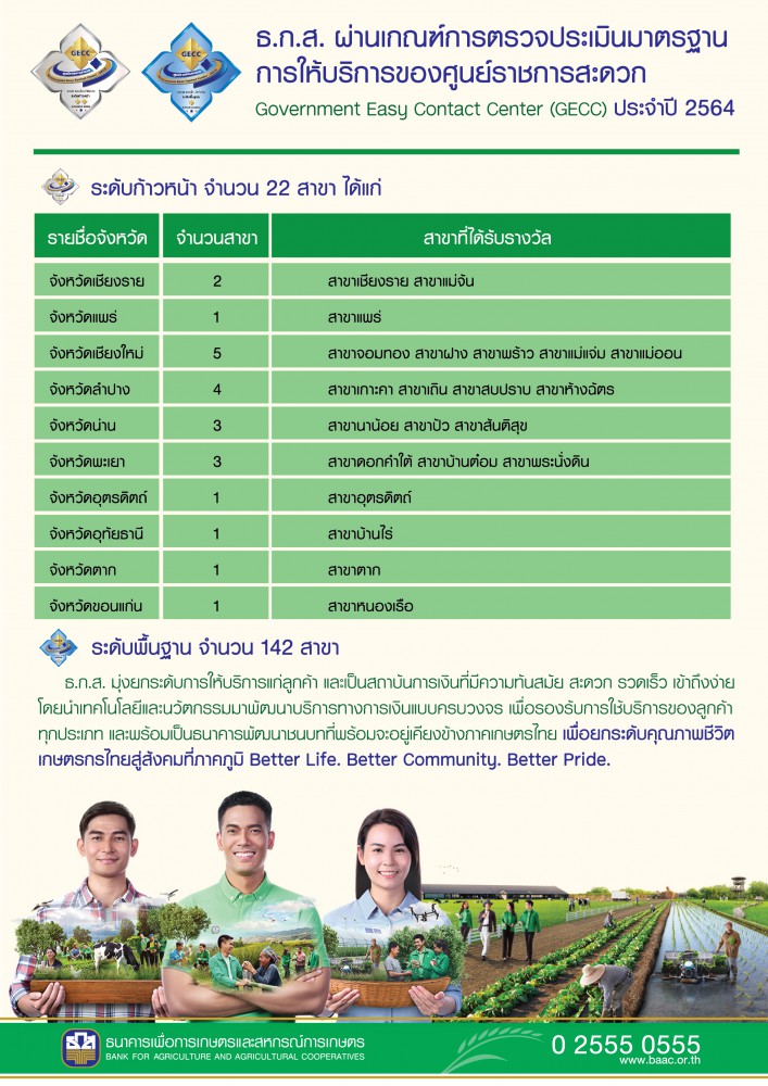 ธ.ก.ส. ผ่านเกณฑ์การตรวจประเมินมาตรฐานการให้บริการของศูนย์ราชการสะดวก หรือ (GECC) ประจำปี 2564ในระดับก้าวหน้า จำนวน 22 สาขา และระดับพื้นฐานจำนวน 142 สาขาสะท้อนคุณภาพของการให้บริการแก่ประชาชนในการเป็นหน่วยงานรัฐที่มีความสะดวก รวดเร็ว และเข้าถึงง่าย