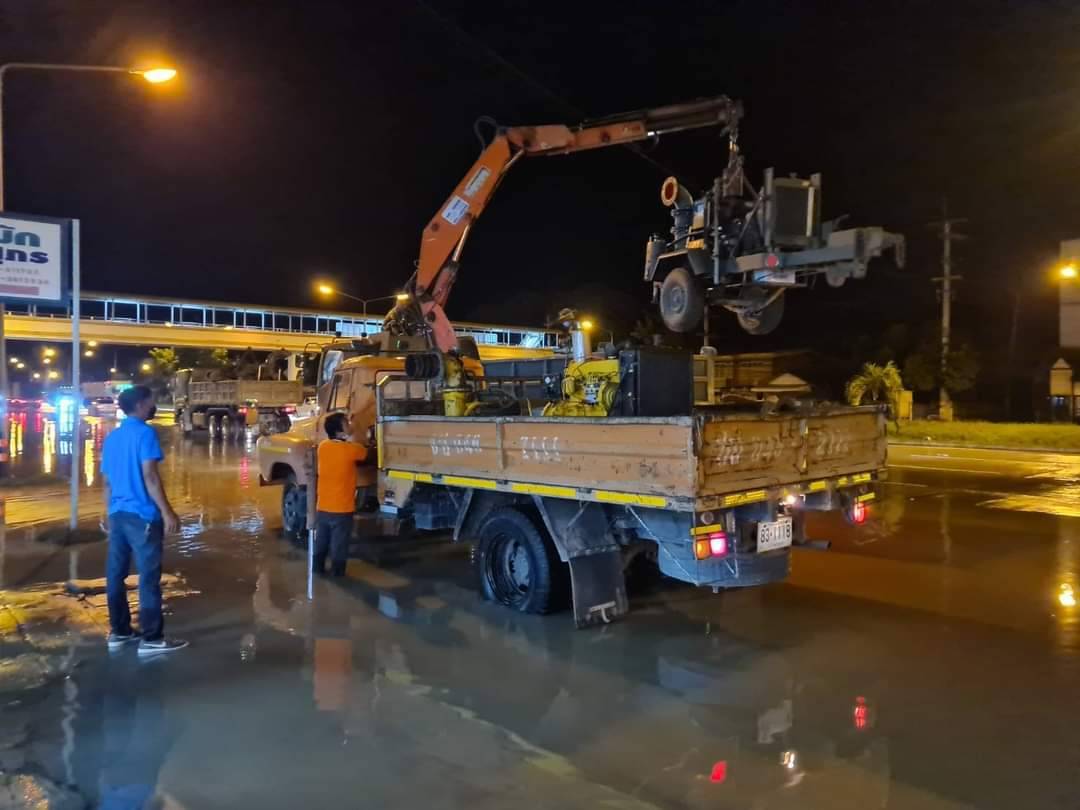 ที่จังหวัดสมุทรปราการ มีน้ำท่วมขัง ในพื้นที่อำเภอบางบ่อ และถนนเลียบคลองพระองค์ไชยานุชิต ระดับน้ำท่วมขังสูงประมาณ 0.20 – 0.30 เมตร และบริเวณที่ต่ำประมาณ 0.50 เมตร สำนักเครื่องจักรกล ได้เข้าติดตั้งเครื่องผลักดันน้ำ 4 เครื่อง บริเวณหน้าโรงพยาบาลและบริเวณหน้าอำเภอบางบ่อ เพื่อเพิ่มประสิทธิภาพในการระบายน้ำ และติดตั้งเครื่องสูบน้ำเพิ่มเติมบริเวณคลองที่เชื่อมกับแม่น้ำบางปะกง เพื่อตัดยอดน้ำให้ออกสู่แม่น้ำบางปะกงและออกสู่ทะเลอ่าวไทยโดยเร็วต่อไป พร้อมทั้งเร่งเดินเครื่องสูบน้ำบริเวณสถานีสูบน้ำชลหารพิจิตร และสถานีสูบน้ำตามแนวคลองชายทะเลรวมทั้งหมด 9 แห่ง ให้ได้ปริมาณการระบายไม่น้อยกว่า 20 ล้าน ลบ.ม./วัน
