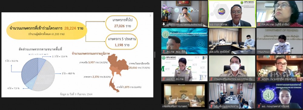 นอกจากนี้ ที่ประชุมยังได้มีการรายงานความก้าวหน้าการสนับสนุนปัจจัยการผลิตให้กับเกษตรกรที่เข้าร่วมโครงการฯ โดยกรมพัฒนาที่ดิน ดำเนินการสนับสนุนวัสดุบำรุงดินให้แก่เกษตรกรแล้ว 67 จังหวัด กรมส่งเสริมการเกษตร อยู่ระหว่างการจัดซื้อจัดจ้างและมอบปัจจัยการผลิตให้แก่เกษตรกร กรมประมง ดำเนินการสนับสนุนปัจจัยการผลิตให้แก่เกษตรกรไปแล้ว 2 รอบ เกษตรกรจำนวน 3,286 ราย แบ่งเป็น พันธุ์ปลานิล 2,300,200 ตัว และอาหารสัตว์น้ำ 3,286 กระสอบ ในพื้นที่ 26 จังหวัด และกรมปศุสัตว์ อยู่ระหว่างดำเนินการจัดซื้อจัดจ้าง และมอบปัจจัยการผลิตให้แก่เกษตรกรแล้ว จำนวน 1,195 ราย