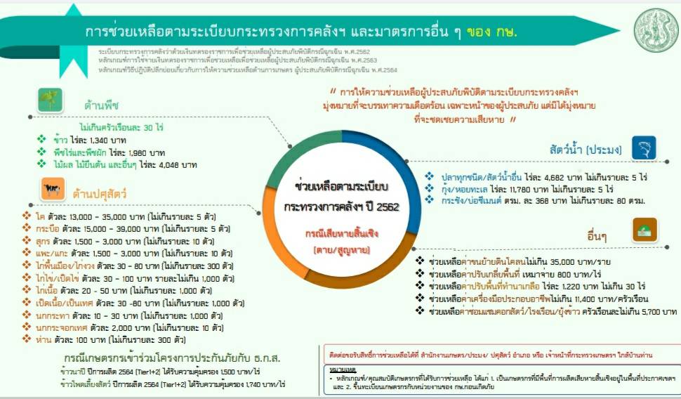 ทั้งนี้ สามารถติดต่อขอรับสิทธิ์การช่วยเหลือได้ที่สำนักงานเกษตร/ประมง/ปศุสัตว์อำเภอ หรือเจ้าหน้าที่กระทรวงเกษตรฯ ใกล้บ้านท่าน โดยหลักเกณฑ์/คุณสมบัติเกษตรกรที่ได้รับการช่วยเหลือ จะต้องเป็นเกษตรกรที่มีพื้นที่การผลิตเสียหายสิ้นเชิงอยู่ในพื้นที่ประกาศเขตฯ และขึ้นทะเบียนเกษตรกรกับหน่วยงานของกระทรวงเกษตรและสหกรณ์ก่อนเกิดภัย