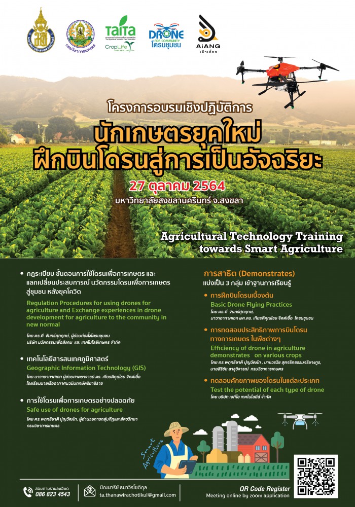 สำหรับเกษตรกร หรือนักศึกษาที่สนใจสามารถเข้าร่วมโครงการอบรมเชิงปฏิบัติการ “นักเกษตรยุคใหม่ ฝึกบินโดรนสู่การเป็นอัจฉริยะ” ผ่านช่องทางออนไลน์ระบบซูม (ZOOM) ในวันที่ 27 ตุลาคม 2564 อบรมฟรี! ไม่มีค่าใช้จ่าย สอบถามรายละเอียดได้ที่ อีเมล ta.thanawirachotikul@gmail.com (คุณปัณนารีย์) หรือโทรศัพท์ 086-823-4543