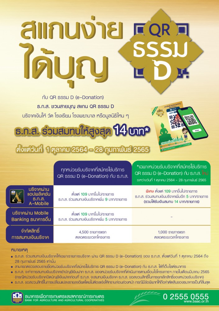 ธ.ก.ส. เชิญชวนผู้มีจิตศรัทธาร่วมทำบุญสร้างกุศล พร้อมรับสิทธิลดหย่อนภาษีผ่านระบบ e-Donation ผ่านการสแกน QR Payment “QR ธรรม D” เผยเป็นช่องทางการบริจาคและส่งเสริมระบบการชำระเงินอิเล็กทรอนิกส์ ทดแทนเงินสดตอบสนอง Lifestyle ยุคใหม่ ในการทำธุรกรรมทางการเงินผ่านโทรศัพท์มือถือโดยทุกยอดการบริจาคตั้งแต่ 109 บาทขึ้นไป ธ.ก.ส. ร่วมสมทบเงินบริจาคสูงสุด 14 บาทต่อรายการตั้งแต่วันนี้ถึง 28 ก.พ. 65