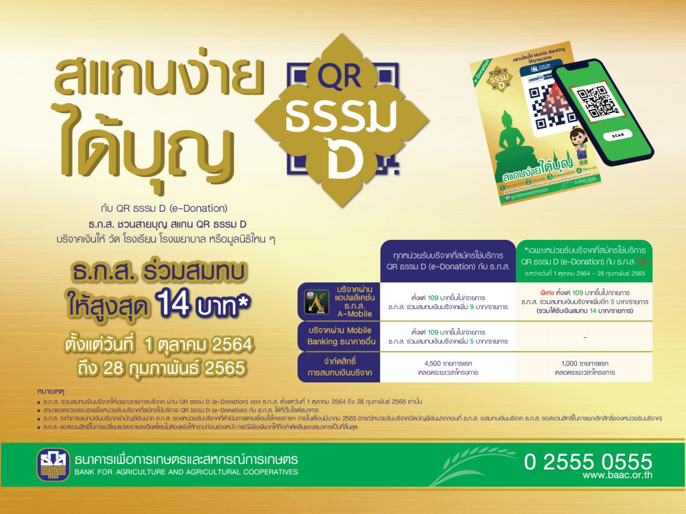 นอกจากนี้ ธ.ก.ส. ยังร่วมทำบุญกับลูกค้าทุกท่านที่ใช้บริการ QR ธรรม Dโดยทุกยอดการบริจาคตั้งแต่ 109 บาทขึ้นไป ธ.ก.ส. จะจ่ายเงินสมทบให้กับหน่วยรับบริจาคที่มีระบบ e-Donation ผ่าน ธ.ก.ส. เพิ่มอีก9 บาทต่อรายการ และกรณีเป็นหน่วยรับบริจาคที่เข้าร่วม QR ธรรม D (e-Donation) ในช่วงระหว่างวันที่ 1 ตุลาคม 2564 ถึง 28 กุมภาพันธ์ 2565 ธ.ก.ส. จะสมทบให้กับหน่วยรับบริจาคเพิ่มอีก 5 บาทต่อรายการ ในทุกยอดการบริจาคตั้งแต่ 109 บาทขึ้นไป (รวมได้รับเงินสมทบ 14 บาท/รายการ)จำนวน 5,500 รายการแรกระยะเวลาร่วมสมทบตั้งแต่วันนี้ ถึง 28 กุมภาพันธ์ 2565