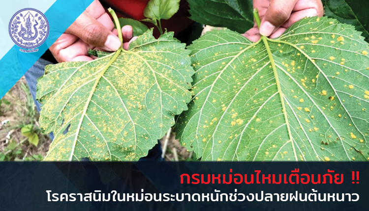 กรมหม่อนไหมเตือน!! เกษตรกรผู้ปลูกหม่อน เฝ้าระวังโรคราสนิมในหม่อนในช่วงปลายฤดูฝนเข้าสู่ฤดูหนาว ชี้หากระบาดรุนแรงมาก จะทำให้ขาดแคลนใบหม่อนมาเลี้ยงไหม แนะเกษตรกรให้ดูแลแปลงหม่อนอย่างใกล้ชิด ระบุถ้าระบาดแล้วต้องพ่นสารกำจัดเชื้อ และเผาทำลายกิ่งหม่อนที่มีเชื้อโรค ป้องกันการระบาดขึ้นมาอีก