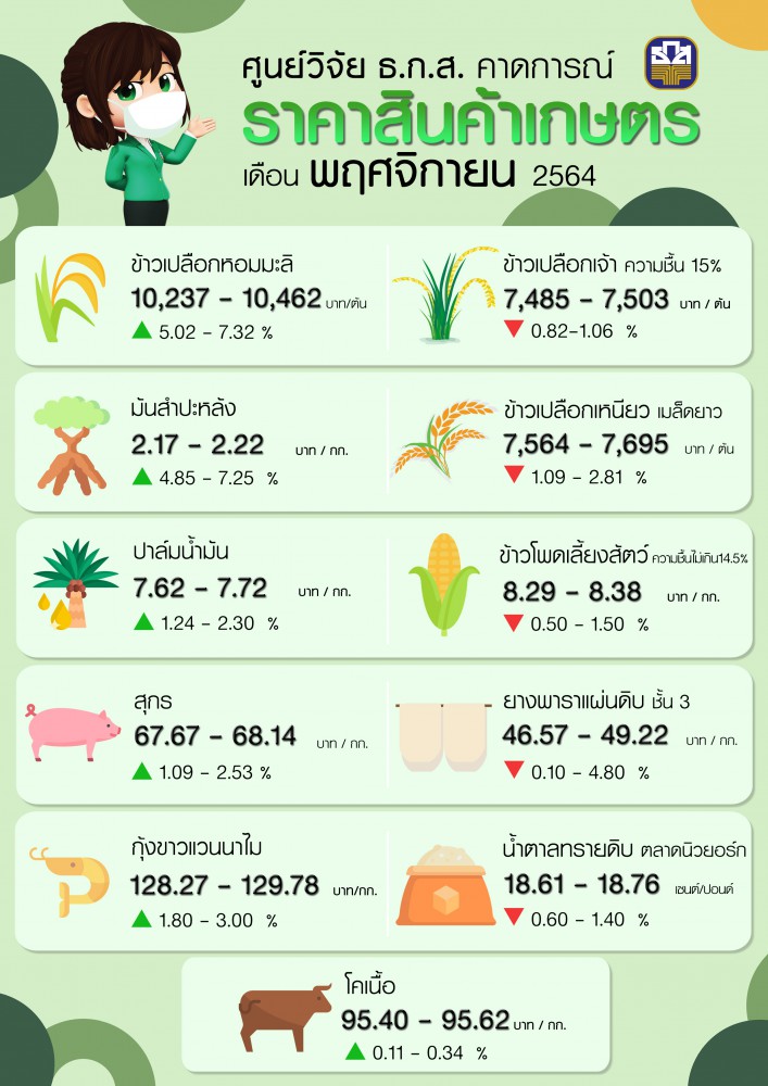 ศูนย์วิจัยและพัฒนานวัตกรรม ธ.ก.ส. ชี้การผ่อนคลายมาตรการล็อกดาวน์เพื่อเตรียมเปิดประเทศ ความต้องการภายในประเทศและตลาดโลก รวมถึงปัญหาภัยธรรมชาติ ทำให้ราคาสินค้าเกษตรเดือนพฤศจิกายน2564 ได้แก่ ข้าวเปลือกหอมมะลิมันสำปะหลังปาล์มน้ำมันสุกรกุ้งขาวแวนนาไม และโคเนื้อ มีแนวโน้มราคาเพิ่มขึ้น ด้านข้าวเปลือกเจ้าข้าวเปลือกเหนียวข้าวโพดเลี้ยงสัตว์ยางพาราแผ่นดิบ และน้ำตาลทรายดิบมีแนวโน้มราคาปรับลดลง