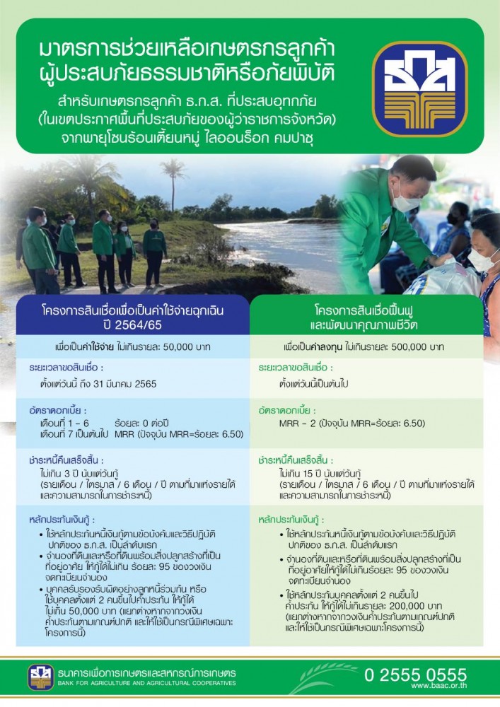 อีกทั้ง ธ.ก.ส. ได้พิจารณาขยายระยะเวลาชำระคืนต้นเงินกู้และดอกเบี้ยออกไปสูงสุดไม่เกิน 12 เดือนตามศักยภาพของลูกหนี้โดยไม่คิดดอกเบี้ยปรับ เพื่อบรรเทาความเดือดร้อนตามความหนักเบาของเกษตรกรผู้ประสบภัย เกษตรกรผู้ประสบความเดือดร้อนสามารถติดต่อธ.ก.ส.ในพื้นที่เพื่อขอรับการช่วยเหลือในด้านต่างๆได้ทันทีหรือสอบถามที่ Call Center 02 5550555 นายสมเกียรติกล่าว