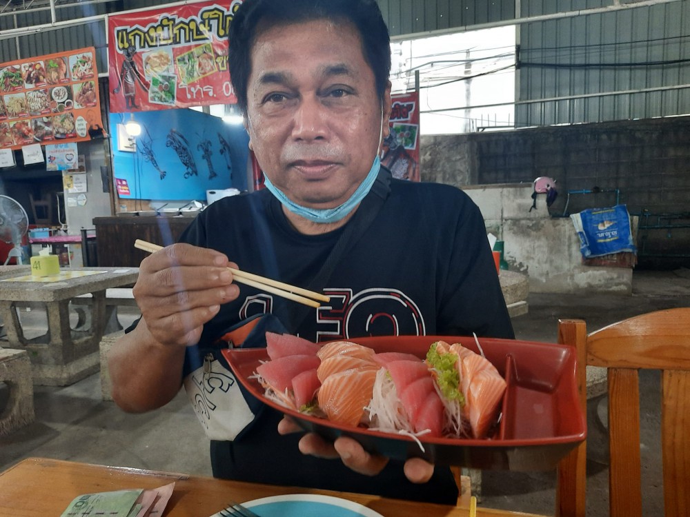 เขา บอกด้วยว่า ปัจจุบันมีเมนูอาหารญี่ปุ่นกว่า 20 รายการ แต่ปลาดิบหรือซาเซมิจะขายดีที่สุด แม้ว่าในสถานการณ์การแพร่ระบาดของเชื้อไวรัสโควิด 19 ก็ยังขายปกติวันละใช้วัตถุดิบปลาแซลมอน 2 ตัวขนาดตัวละ 7 กิโลกรัม และปลาทูน่าอีก เฉลี่ยแล้วในแต่ละวันจะขายได้รับร้อยจาน ในลักษณ์ขายหมดแล้วหมดเลยและหมดทุกวันด้วย