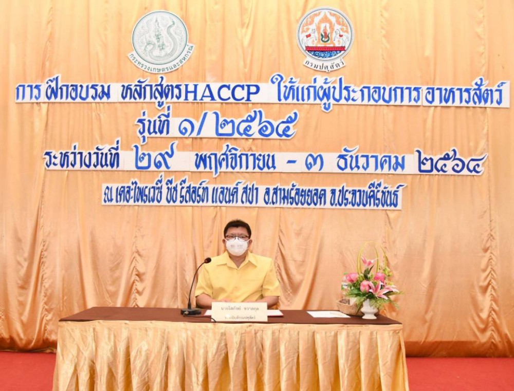 เมื่อเวลาเวลา 09.00 น. วันที่ 29 พฤศจิกายน 2564 นายสัตวแพทย์สรวิศ ธานีโต อธิบดีกรมปศุสัตว์ มอบหมายให้นายสัตวแพทย์โสภัชย์ ชวาลกุล รองอธิบดีกรมปศุสัตว์ เป็นประธานเปิดการฝึกอบรมเชิงปฏิบัติการ หลักสูตร HACCP สำหรับผู้ประกอบการอาหารสัตว์ โดยมีนายสัตวแพทย์รักไทย งามภักดิ์ ผู้อำนวยการกองควบคุมอาหารและยาสัตว์ กล่าวรายงาน พร้อมผู้เข้าร่วมอบรมรุ่นที่ 1 จำนวน 50 คน โดยมีการเว้นระยะห่างทางสังคมอย่างเคร่งครัด ในระหว่างวันที่ 29 พฤศจิกายน – 3 ธันวาคม 2564 ณ เดอะไพรเวซี่ บีช รีสอร์ท แอนด์ สปา จังหวัดประจวบคีรีขันธ์ (ได้รับการรับรอง SHA)