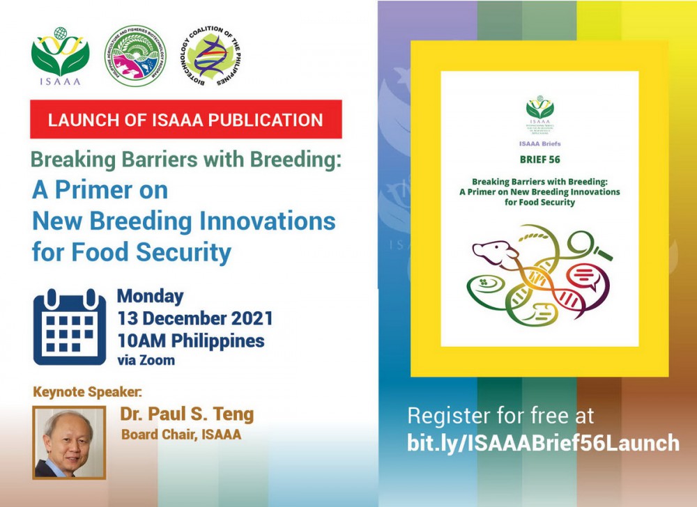องค์การไอซ่า (ISAAA) ร่วมกับสำนักงานโครงการเทคโนโลยีชีวภาพของกรมวิชาการเกษตรแห่งฟิลิปปินส์ (Philippine Department of Agriculture Biotechnology Program Office) และแนวร่วมเทคโนโลยีชีวภาพแห่งฟิลิปปินส์(Biotech Coalition of the Philippines) จะเปิดตัวสิ่งพิมพ์ล่าสุดในชื่อ “Breaking Barriers with Breeding: A Primer on New Breeding Innovations for Food Security”(การแก้ปัญหาด้วยการปรับปรุงพันธุ์: มูลบทของนวัตกรรมใหม่ในการปรับปรุงพันธุ์ใหม่เพื่อความมั่นคงด้านอาหาร) ในวันที่ 13 ธันวาคม 2564 เวลา 10.00 น. GMT +8 (เวลา 09:00 น ประเทศไทย) ผ่านZoom