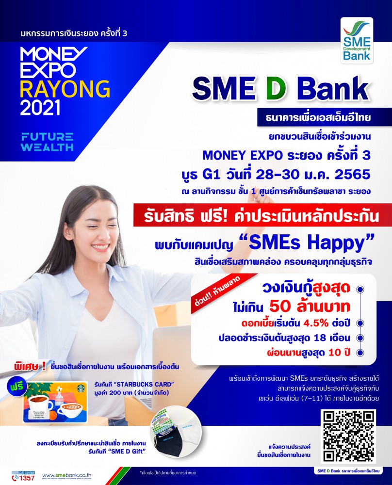 ธนาคารพัฒนาวิสาหกิจขนาดกลางและขนาดย่อมแห่งประเทศไทย (ธพว.) หรือ SME D Bank ยกขบวนบริการ ทั้งการเงิน และการพัฒนา พร้อมเสิร์ฟใน “มหกรรมการเงินระยอง ครั้งที่ 3” หรือ “MONEY EXPO RAYONG 2021” ระหว่างวันที่ 28-30 ม.ค. 2565 ณ ลานกิจกรรม ชั้น 1 ศูนย์การค้าเซ็นทรัลพลาซา ระยอง บูธ SME D Bank หมายเลข G 1