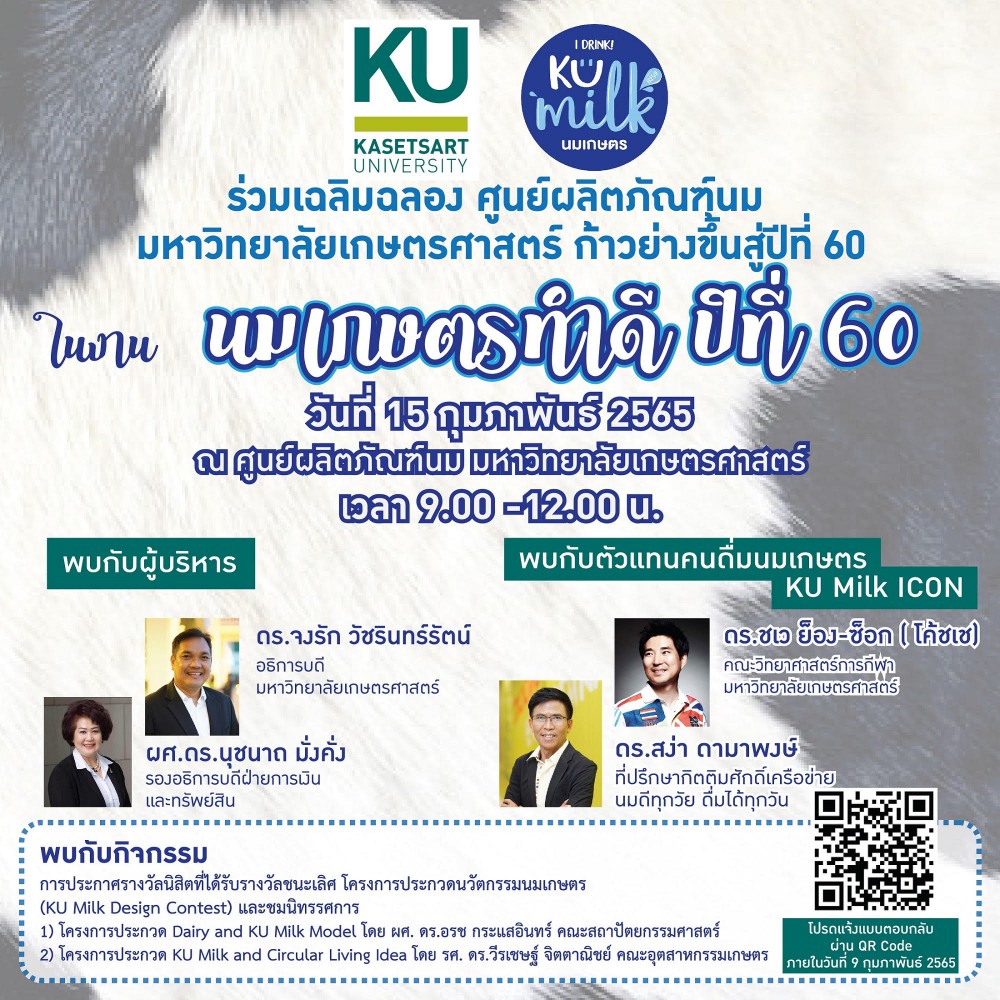 ศูนย์ผลิตภัณฑ์นม มหาวิทยาลัยเกษตรศาสตร์ ผู้ผลิตสินค้า นมเกษตร และน้ำดื่มตราเกษตร จัดงาน “นมเกษตรทำดี ปีที่ 60” เนื่องในโอกาสเฉลิมฉลองศูนย์ผลิตภัณฑ์นม มก. ก้าวขึ้นสู่ปีที่ 60 พบกับผู้บริหาร ดร.จงรัก วัชรินทร์รัตน์ อธิการบดี มหาวิทยาลัยเกษตรศาสตร์ และ ผศ. ดร.นุชนาถ มั่งคั่ง รองอธิการบดีฝ่ายการเงินและทรัพย์สิน ร่วมพูดคุยการก้าวสู่การดำเนินงานเชิงรุกแบบธุรกิจเต็มรูปแบบของ “ นมเกษตร ” และการเตรียมความพร้อมสู่ KUniverse