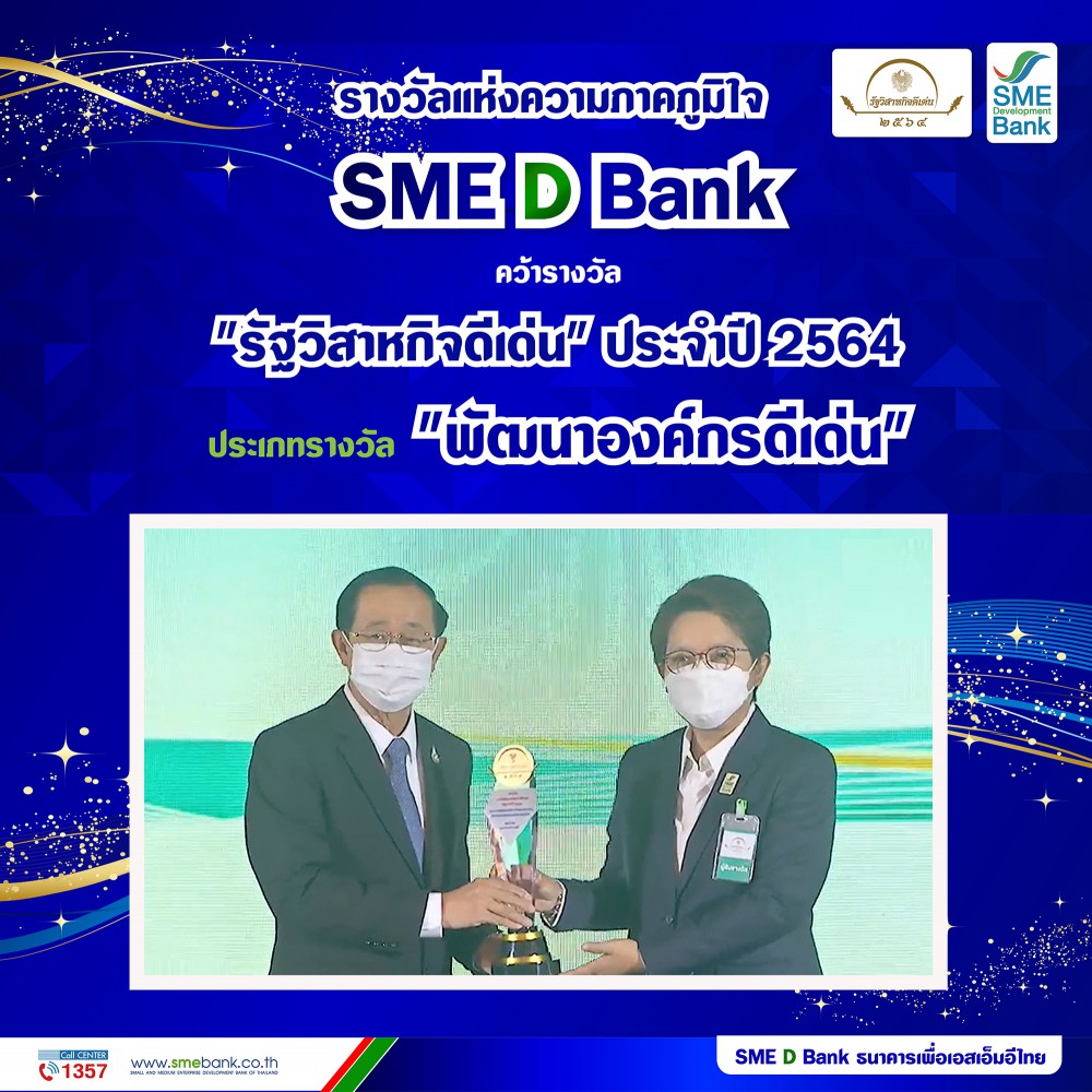 วันที่31 มกราคม 2565 ธนาคารพัฒนาวิสาหกิจขนาดกลางและขนาดย่อมแห่งประเทศไทย (ธพว.) หรือ SME D Bank เข้ารับรางวัลรัฐวิสาหกิจดีเด่น ประจำปี 2564 ประเภท “รางวัลพัฒนาองค์กรดีเด่น” ภายใต้แนวคิด “ก้าวสู่ยุควิถีใหม่ด้วยพลังรัฐวิสาหกิจไทยอย่างยั่งยืน Sustainable Moving Towards The Next Normal” จัดโดยสำนักงานคณะกรรมการนโยบายรัฐวิสาหกิจ (สคร.) โดยได้รับเกียรติจาก นายอาคม เติมพิทยาไพสิฐ รัฐมนตรีว่าการกระทรวงการคลัง ซึ่งได้รับมอบหมายนายกรัฐมนตรีให้เป็นประธานในพิธี และมอบรางวัล ณ ตึกสันติไมตรี ทำเนียบรัฐบาล