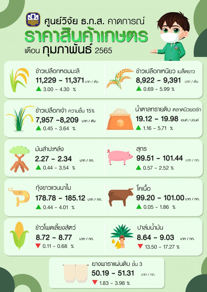 ศูนย์วิจัยและพัฒนานวัตกรรม ธ.ก.ส. คาดความต้องการสินค้าจากประเทศคู่ค้าที่เพิ่มขึ้นและมาตรการสนับสนุนของรัฐบาลทำให้ในเดือนกุมภาพันธ์ 2565 ราคาสินค้าเกษตรส่วนใหญ่ ทั้งข้าวเปลือกเจ้า ข้าวเปลือกเจ้าหอมมะลิ ข้าวเปลือกเหนียวเมล็ดยาว น้ำตาลทรายดิบ มันสำปะหลัง สุกร กุ้งขาวแวนนาไม และโคเนื้อมีแนวโน้มราคาเพิ่มขึ้น ด้านข้าวโพดเลี้ยงสัตว์ปาล์มน้ำมัน และยางพาราดิบชั้น 3 มีแนวโน้มราคาปรับลดลง