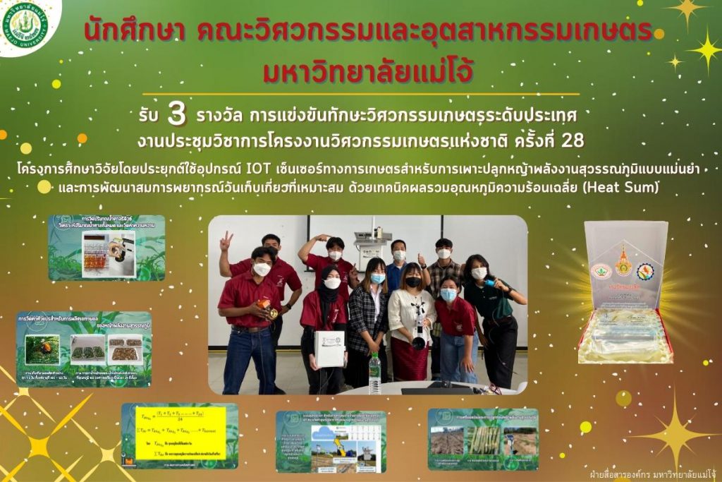 สุดยอดผลงานวิจัยนักศึกษาคณะวิศวกรรมฯ ม.แม่โจ้ “ประยุกต์อุปกรณ์ IOT ทางการเกษตรสร้างสูตรพยากรณ์วันเก็บเกี่ยวหญ้าพลังงานสุวรรณภูมิ” ช่วยเพิ่มรายได้ให้เกษตรกร จนได้รับ 3 รางวัล การแข่งขันทักษะวิศวกรรมเกษตรระดับประเทศ ปี 2565
