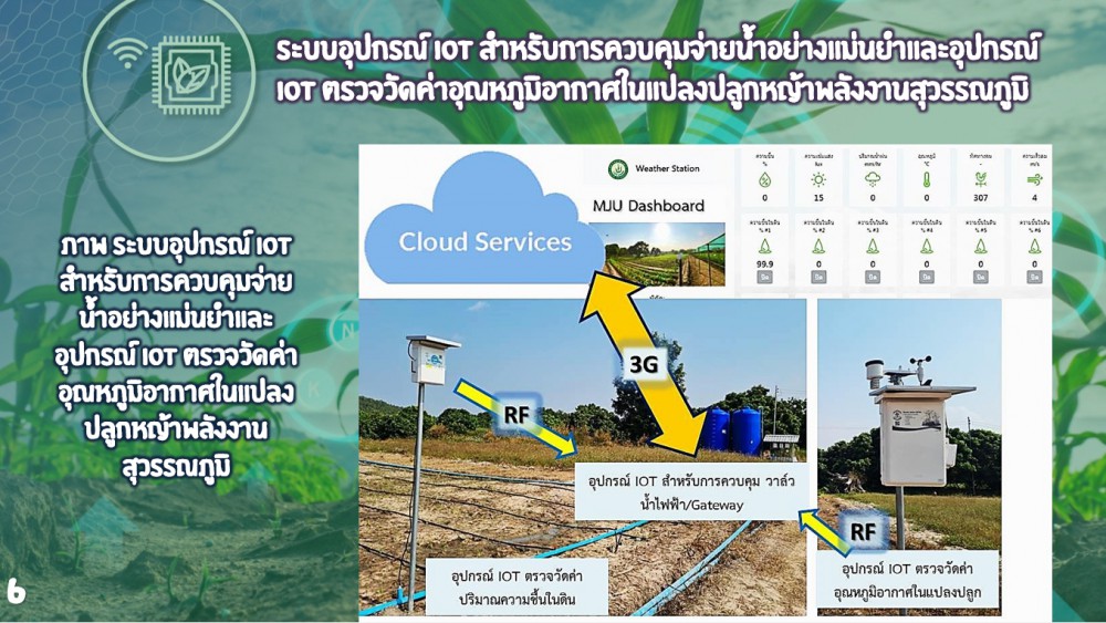 ด้วยเหตุนี้นักศึกษาสาขาวิศวกรรมเกษตร คณะวิศวกรรมและอุตสาหกรรมเกษตร ประกอบด้วย นางสาววรัมพร ใจหมั้น, นางสาวศิริญญา บุญรอด, นางสาวจันทนิภา ชัยธีรเดช, นายทัตเทพ ไพรพฤกษ์ และนายภูทกฤต เชื้อประดิษฐ์ โดยมี ผศ.ดร.โชติพงศ์ กาญจนประโชติ, ผศ.ดร.ปารวี กาญจนประโชติ และ รศ.ดร.สุเนตร สืบค้า เป็นอาจารย์ที่ปรึกษา ได้ทำโครงการศึกษาวิจัยโดยประยุกต์ใช้อุปกรณ์ IOT เซ็นเซอร์ทางการเกษตรสำหรับการเพาะปลูกหญ้าพลังงานสุวรรณภูมิแบบแม่นยำ และการพัฒนาสมการพยากรณ์วันเก็บเกี่ยวที่เหมาะสม ด้วยเทคนิคผลรวมอุณหภูมิความร้อนเฉลี่ย (Heat Sum) ทำให้ได้สมการพยากรณ์วันเก็บเกี่ยวที่แม่นยำ ได้ผลผลิตเพิ่ม ช่วยให้เกษตรกรมีรายได้สูงขึ้น