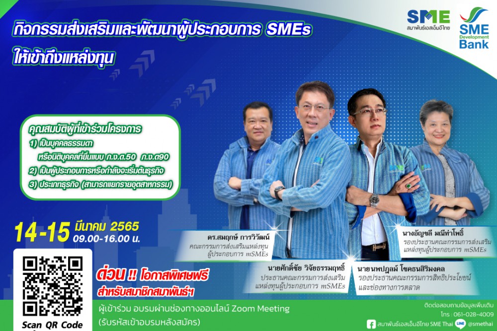 SME D Bank จับมือ สมาพันธ์เอสเอ็มอีไทย จัด “กิจกรรมส่งเสริมและพัฒนาผู้ประกอบการ SMEs ให้เข้าถึงแหล่งทุน” สนับสนุนครบวงจรตั้งแต่มอบความรู้ สอนลงมือปฏิบัติจริง ที่สำคัญพาจับคู่สู่แหล่งทุน ช่วยเสริมแกร่งธุรกิจก้าวผ่านโควิด-19 เผยจัดผ่านระบบออนไลน์ แบ่งเป็น 2 รุ่น ประเดิม 14-15 มีนาคม 2565 นี้ เปิดรับสมัครฟรี