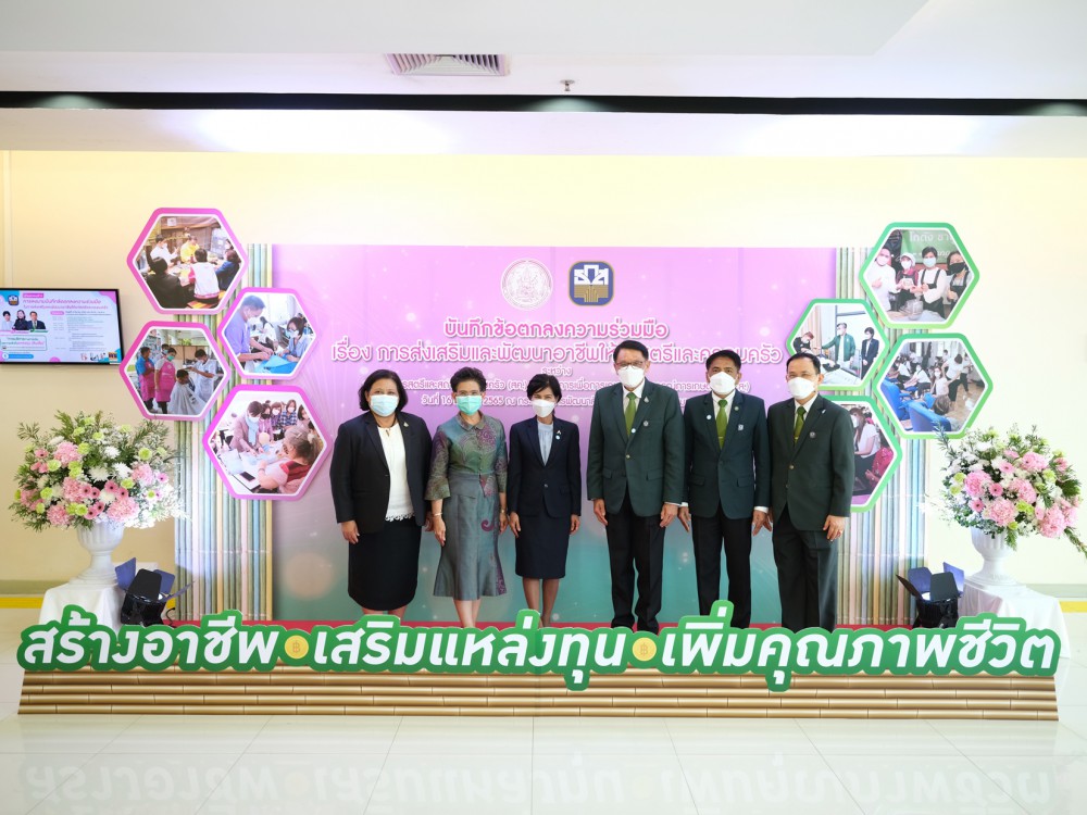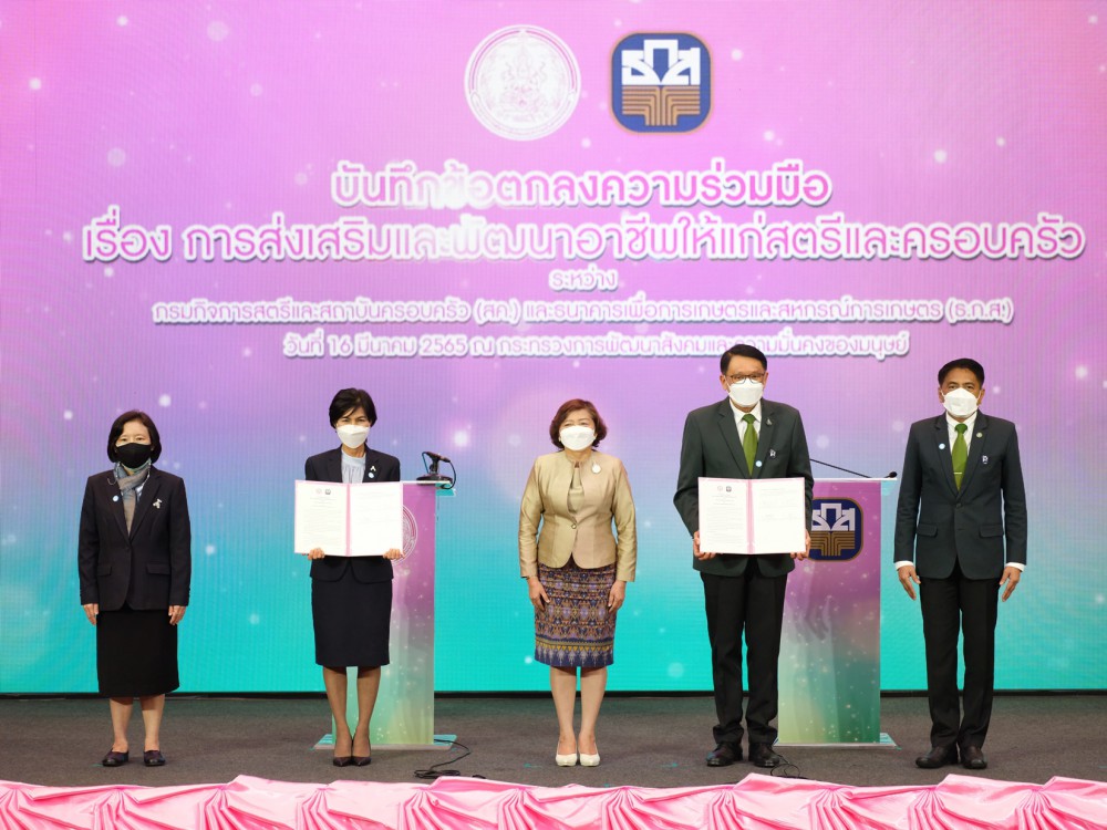 นายธนารัตน์ งามวลัยรัตน์ ผู้จัดการธนาคารเพื่อการเกษตรและสหกรณ์การเกษตร (ธ.ก.ส.) พร้อมนางจินตนา จันทร์บำรุง อธิบดีกรมกิจการสตรีและสถาบันครอบครัว ร่วมงานแถลงข่าวและลงนามบันทึกข้อตกลงความร่วมมือในการส่งเสริมและพัฒนาอาชีพให้แก่สตรีและครอบครัว